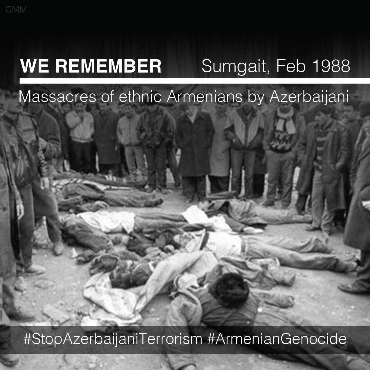 Сумгаитская резня положила начало целой серии преступлений против человечности, совершаемых в рамках государственной политики Азербайджана в отношении армянского народа на всех этапах азербайджано-карабахского конфликта. Геноцид, систематические этнические чистки и массовые убийства, осуществленные азербайджанскими властями в 1988-1991 годах, после распада СССР сменились военными преступлениями в ходе вооруженных агрессий против Республики Арцах и ее народа в 1991-1994, 2016 и 2020 годах.