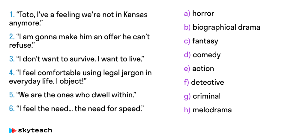 Начните урок с вопроса “What movie genres do you know?” Затем попросите прочесть цитаты и подумать, в фильмах каких жанров их можно услышать. Раздайте ученикам список жанров, чтобы они соединили их с цитатами.