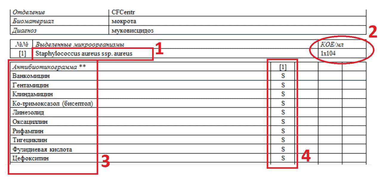 На бланке теста будут обозначения в виде букв R или S. R (Resistant) – резистентность бактерий к данному бактериофагу или антибиотику, S (Sensitive) – чувствительность возбудителя к препарату.