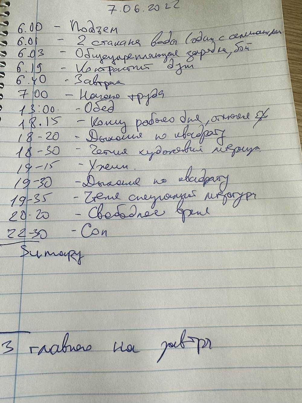 - Каждый успешный пункт в распорядке дня помечается галочкой. При отсутствии хотя бы одной галочки лист зачеркивается, вырывается из ежедневника и летит в мусор.
