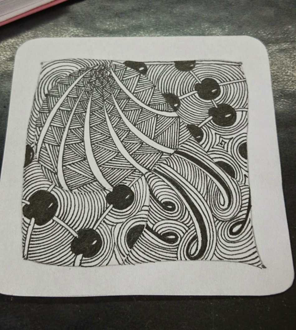 Слово «zen» — означает спокойствие, уравновешенность, «rectangle»- квадрат, прямоугольник. Рисовать в технике зентангл также просто, как и в дудлинге, но между двумя этими техниками есть существенные отличия. Если рисование в стиле дудлинг происходит по большей части интуитивно, то зентангл – требует большой концентрации внимания. Вместо произвольных форм, характерных для дудлинга, зентангл подразумевает четко очерченные границы. Как правило, это квадраты 9х9 сантиметров, внутри которых рисуются отдельные маленькие композиции. Они могут существовать как отдельные рисунки, или же соединяться вместе, образуя один большой квадрат. Для заполнения квадратов используют геометрические фигуры, точки, соединения прямых и изогнутых линий.