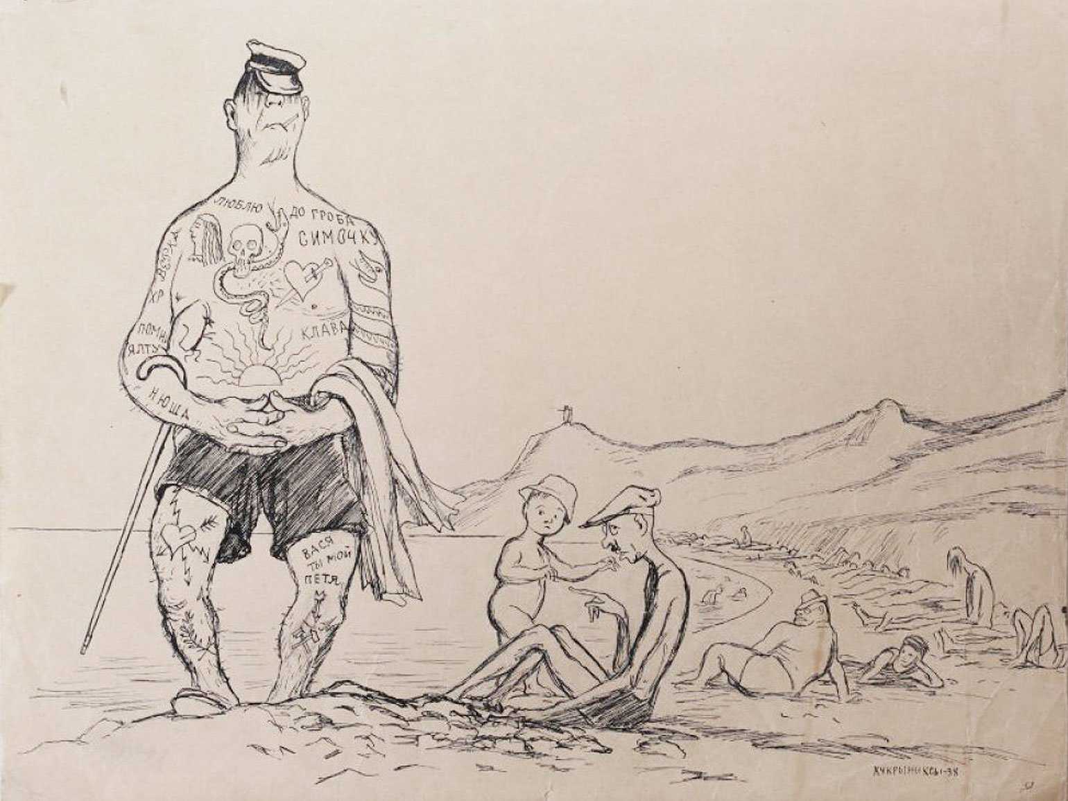 Кукрыниксы, «Ненаглядное пособие». На карикатурном рисунке сцена с татуированным моряком и удивлённым ребёнкомИзображение: Пермская художественная галерея