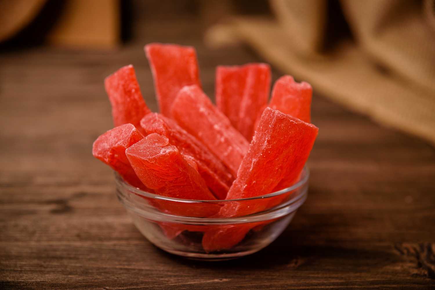 Спелый плод нужно тщательно очистить от косточек и кожуры, а мякоть порезать небольшими полосками. Далее приготовьте сироп. Для этого необходимо развести сахар в воде и закипятить. Добавьте в полученный сироп кусочки плода и проварите их 5 минут, остудите. С интервалом в два часа нужно дважды повторить кипячение. На конечном этапе добавьте лимонный сок и цедру, откиньте цукаты на дуршлаг и оставьте примерно на 1 час. Затем ломтики необходимо просушить на протяжении 12 часов, обсыпать сахарной пудрой и снова досушить не менее 48 часов.