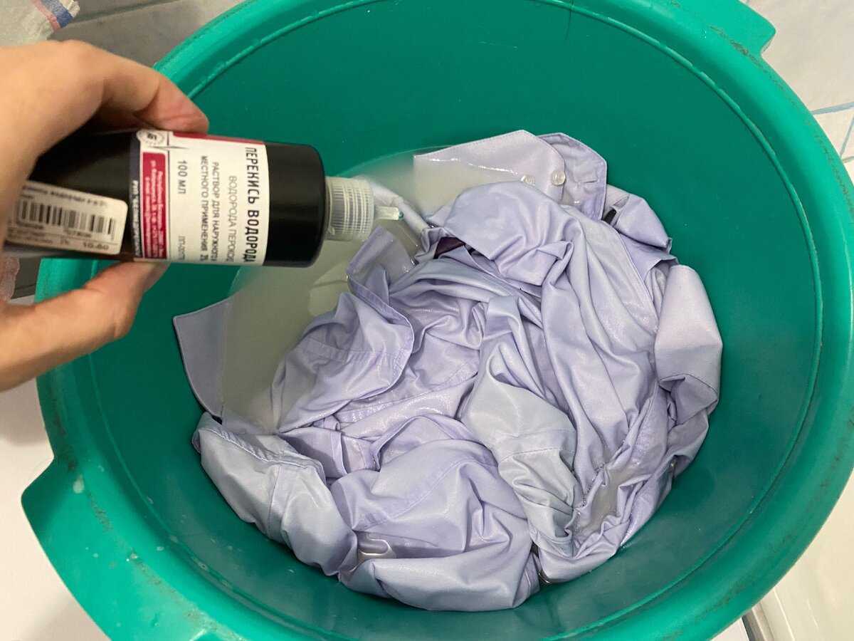 Отстирать полинявшую белую вещь из тонкой ткани поможет смесь из 2 л воды (температурой +70 ℃), 1 ст. л. 3%-й перекиси водорода и щепотки пищевой соды. Положите в раствор изделие на 10-15 минут, в процессе замачивания переверните его несколько раз, чтобы оно равномерно отбелилось, а затем прополощите.