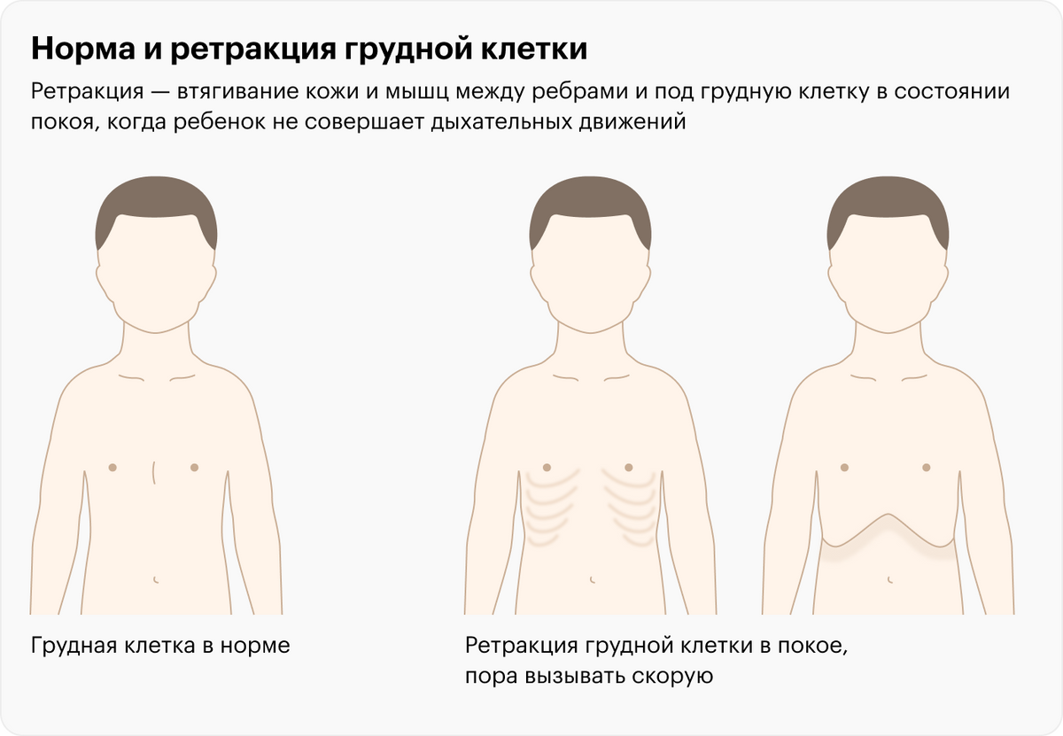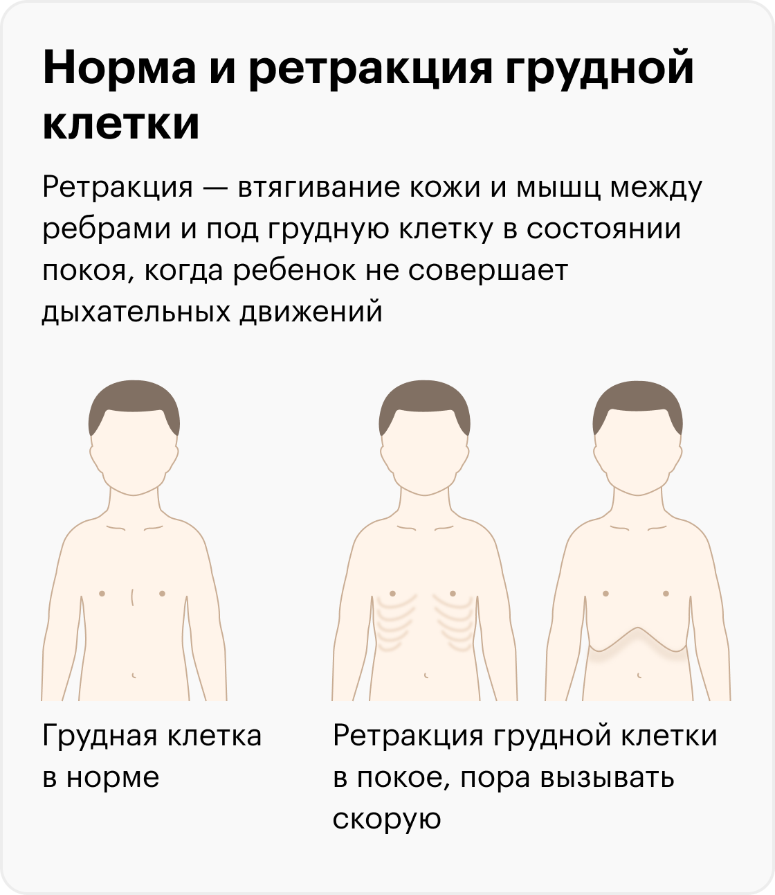 Важно следить за тем, как ребенок совершает дыхательные движения. Еще один тревожный признак, требующий срочного вызова скорой, — ретракция, то есть втягивание кожи и мышц между ребрами и под грудную клетку в состоянии покоя, когда ребенок не совершает дыхательных движений