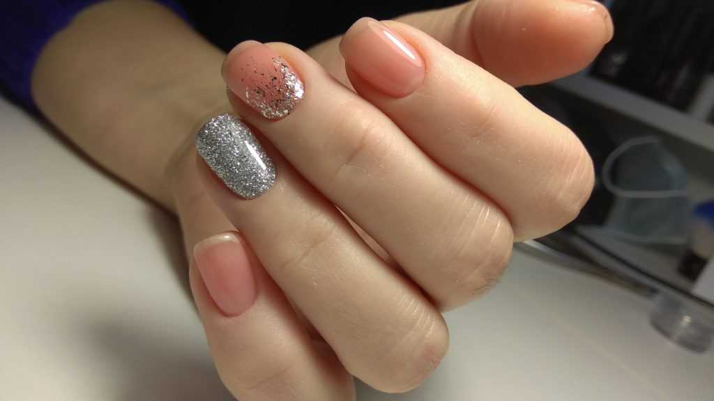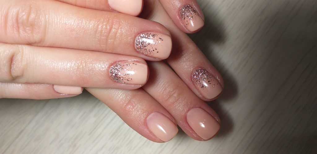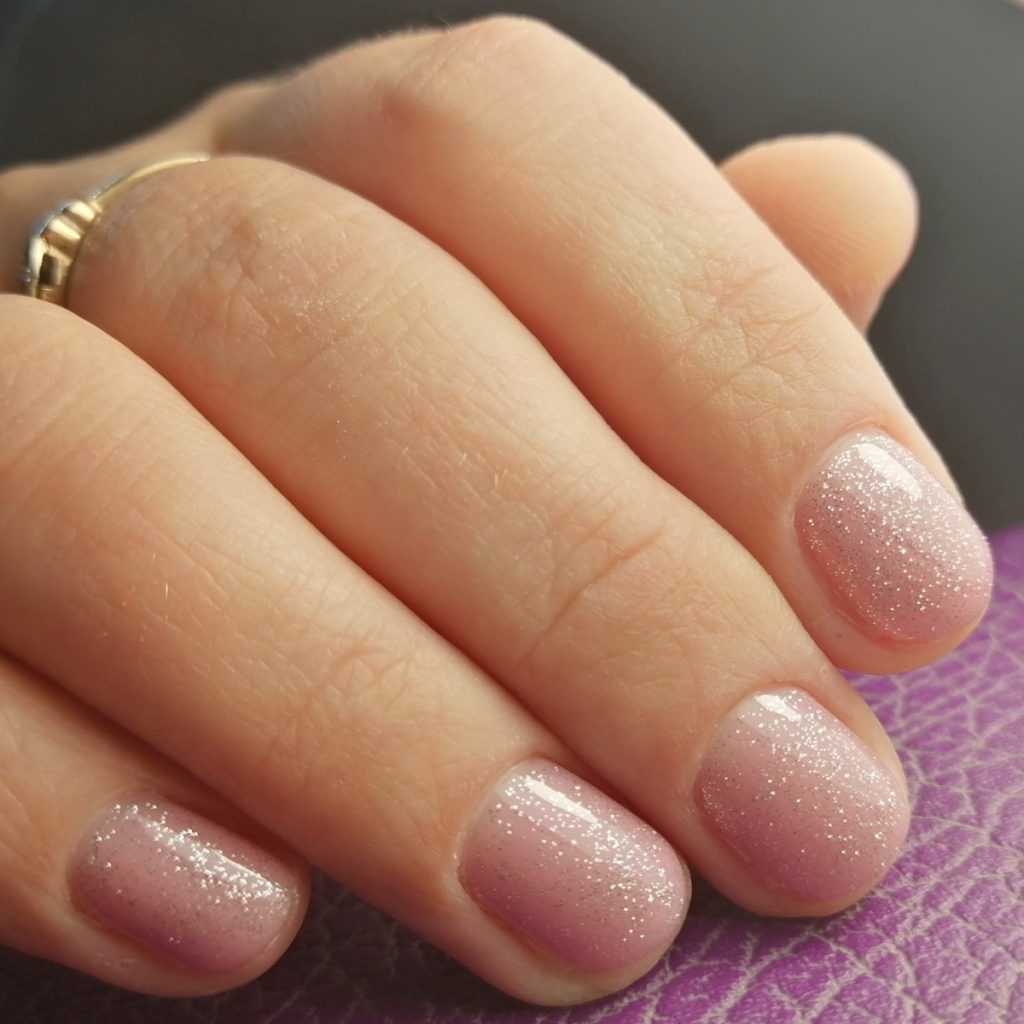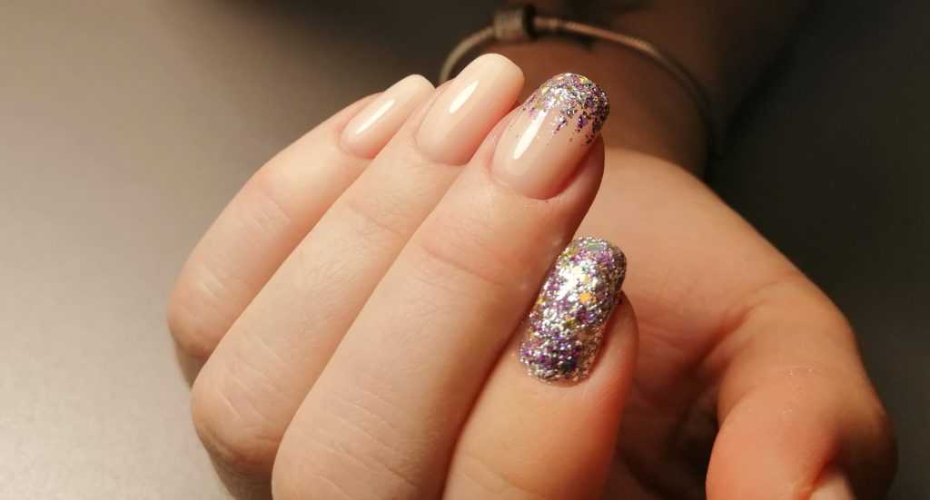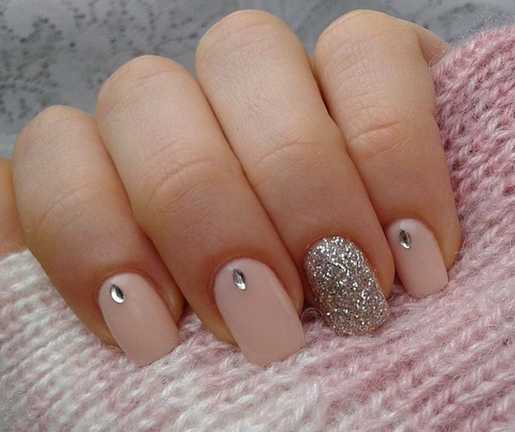 На фото модные тенденции 2019 нюдового дизайна ногтей с блестками: