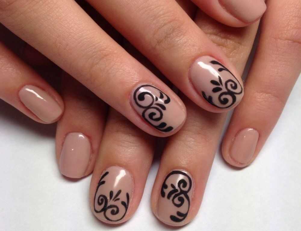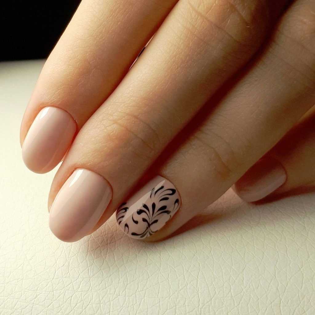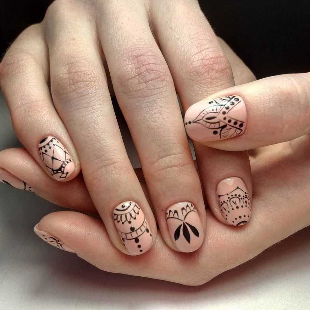 Разбавить спокойный и нежный вид ногтей можно с помощью черного цвета. Его должно быть немного. Это могут быть: небольшие полосы; узоры и орнаменты; геометрические фигуры. Материал – гель-лак, акриловая краска, слайдеры, трафареты.