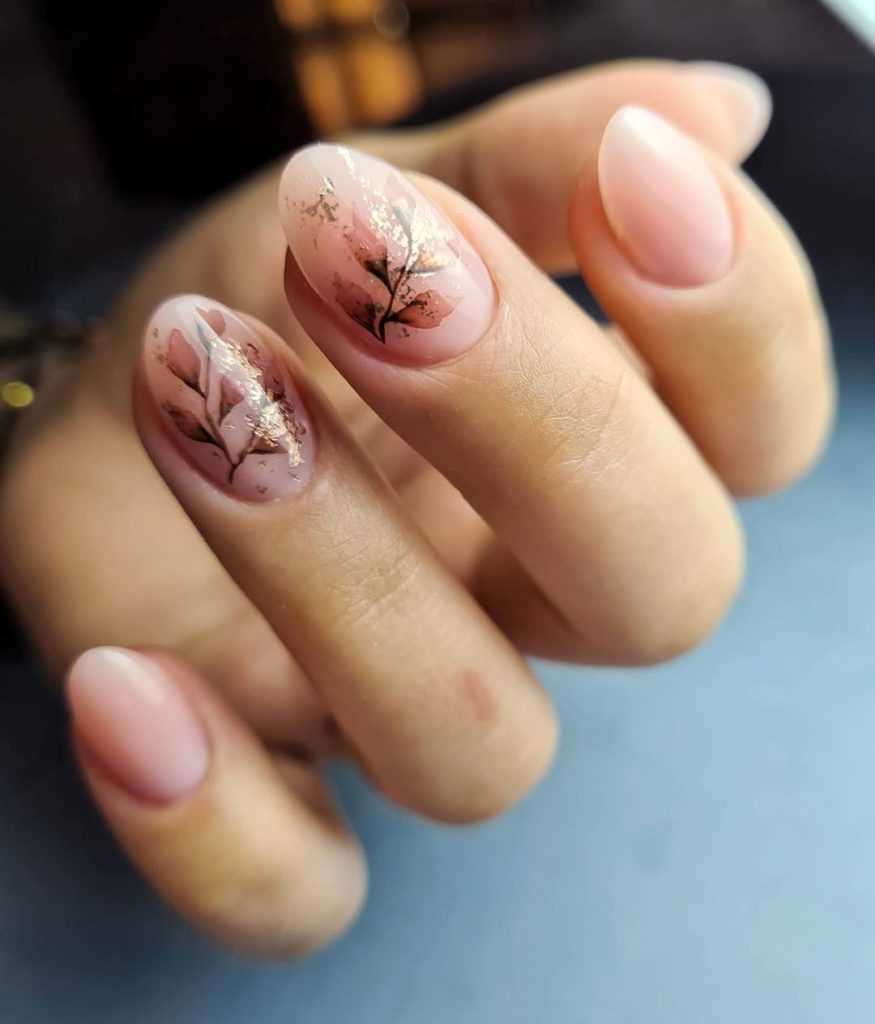 Оптимальный вариант — молочной база и чуть-чуть акварели или небольшой рисунок в минималистичном стиле. Один из трендов этого сезона — флористический дизайн. Просто добавьте нюдовым ноготкам тонкие веточки травы или других растений, и ваш маникюр будет удивительно стильным и заметным.