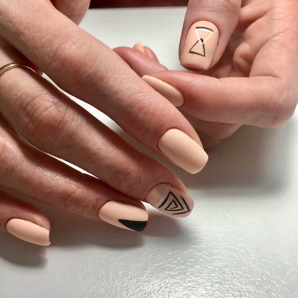 Еще один стильный вариант — легкий намек на геометрию, выполненный на персиковой нежной базе. Хотя геометрические мотивы на нюдовый базе могут быть и очень-очень заметными. Их можно разбавить паутинкой или флористическими мотивами. В общем, подключайте фантазию, и ваш маникюр будет очень стильным и элегантным.