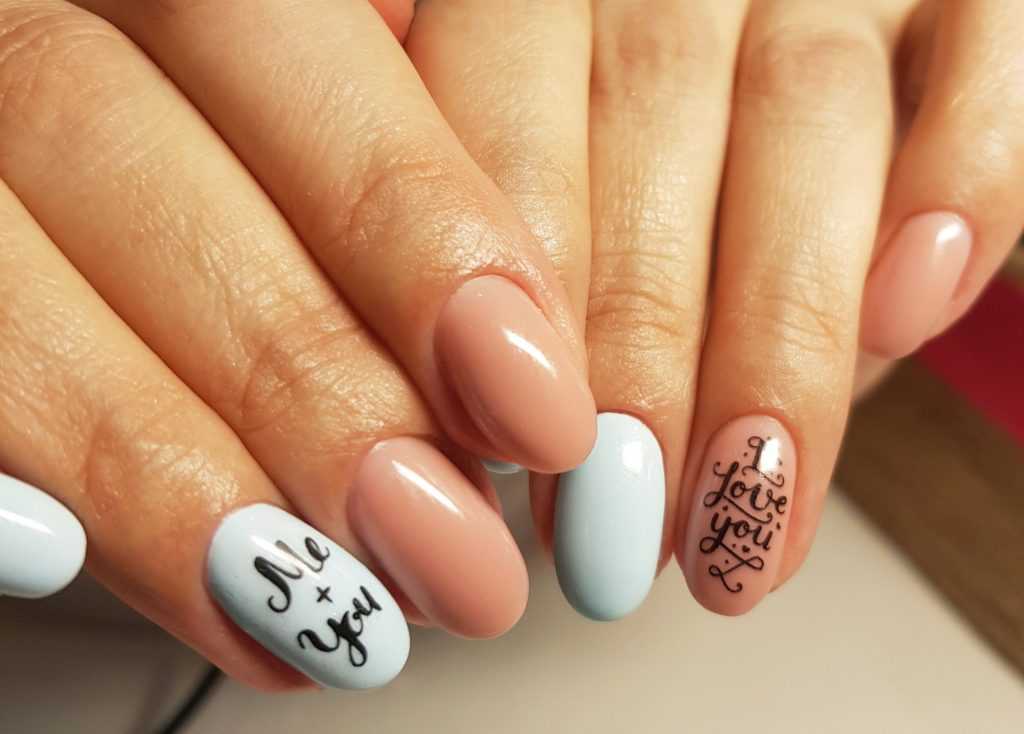 Надписи здесь будут весьма уместными. Они могут быть на разных языках. Рекомендуется не покрывать буквами более половины ногтевой пластины. Отлично подойдут наклейки и слайдеры, тонкая кисть и акриловые краски (кроме ядовитых тонов).