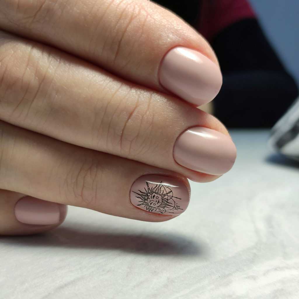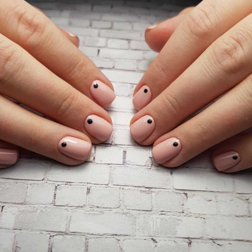 Нюдовый маникюр смотрится аккуратно и ухоженно в однотонном исполнении. Если вы добавите на свои ноготки легкие ненавязчивые штрихи в виде точек или графических фигурок контрастных цветов, получится креативный дизайн. С таким оформлением вы точно будете привлекать взгляды: маникюр подойдет к любому образу и будет уместен в любое время года.