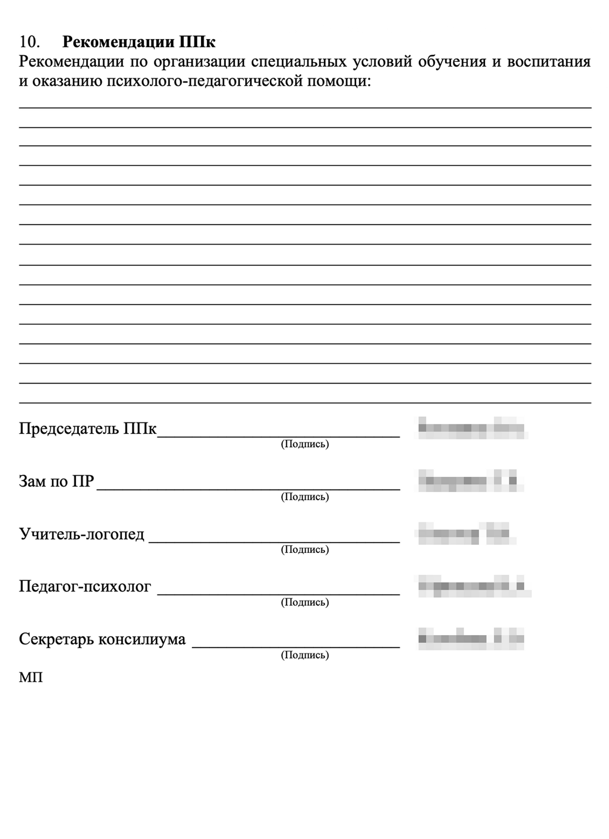 Специалисты осматривают ребенка в рамках своих компетенций и пишут заключение. Затем руководитель комиссии составляет общее заключение с результатами ПМПК и рекомендациями. В нем указаны: