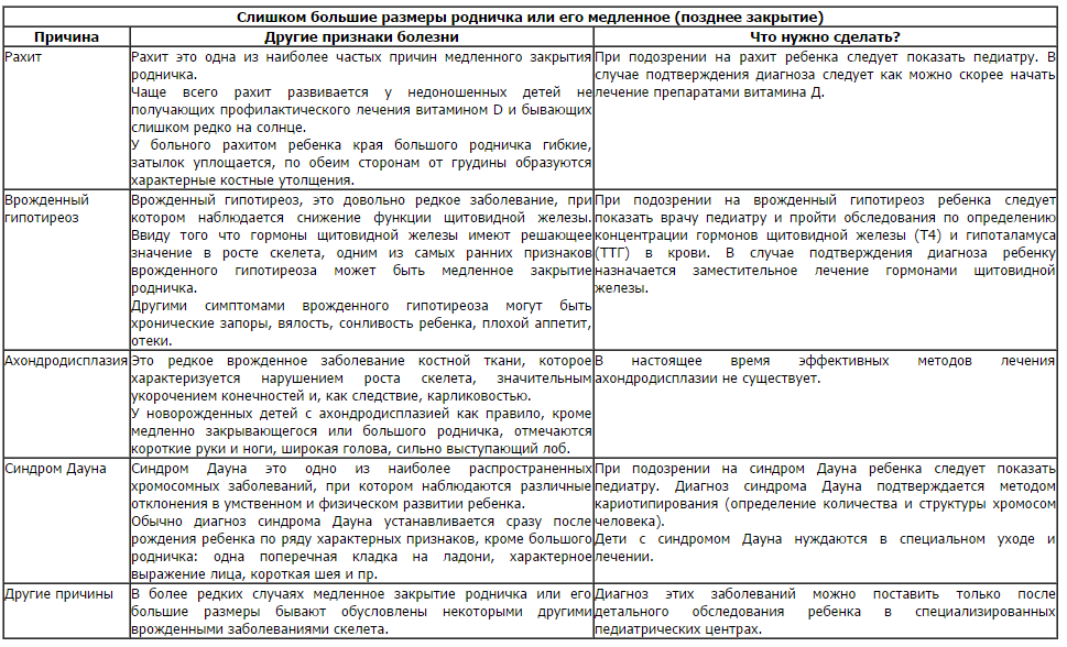 Когда родничок закрывается подозрительно поздно, это может сигнализировать о гипотиреозе, рахите, архондродисплазии и даже синдроме Дауна. Подтвердить или опровергнуть диагноз может только врач.