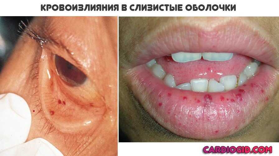 Кровоизлияния в слизистые оболочки. Хорошо заметны при визуальной оценке ротовой полости. Страдает небо, миндалины. Обнаруживаются изменения со стороны десен, век, носа.