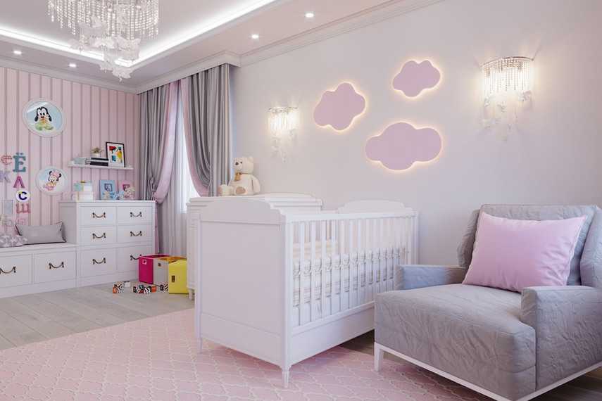 В детской важно совместить центральную люстру и несколько ламп (бра, торшеры), которые осветят рабочую или игровую зону. Главная задача искусственных источников света – обеспечить равномерность распределения мягкого освещения