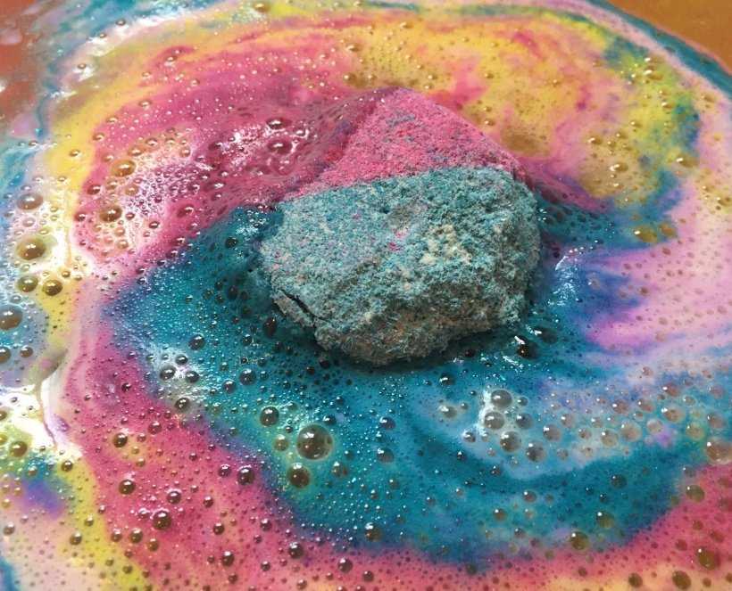 - Радужные бомбочки. Для приготовления этого состава понадобится несколько цветов. Однако если мы будем добавлять их в одну емкость, они перемешаются и результат нас точно не порадует. Поэтому делаем основу из привычных компонентов и разделяем ее на несколько частей. В каждую часть добавляем свой оттенок – красный, зеленый, желтый. Затем перекладываем три массы в одну емкость и посыпаем блестками. Перемешиваем, но не очень интенсивно, чтобы цвета различались и не превратились в однородное месиво. При забрасывании бомбочек в воду она начнет бурлить различными оттенками, а блестки сделают шоу еще более красочным.