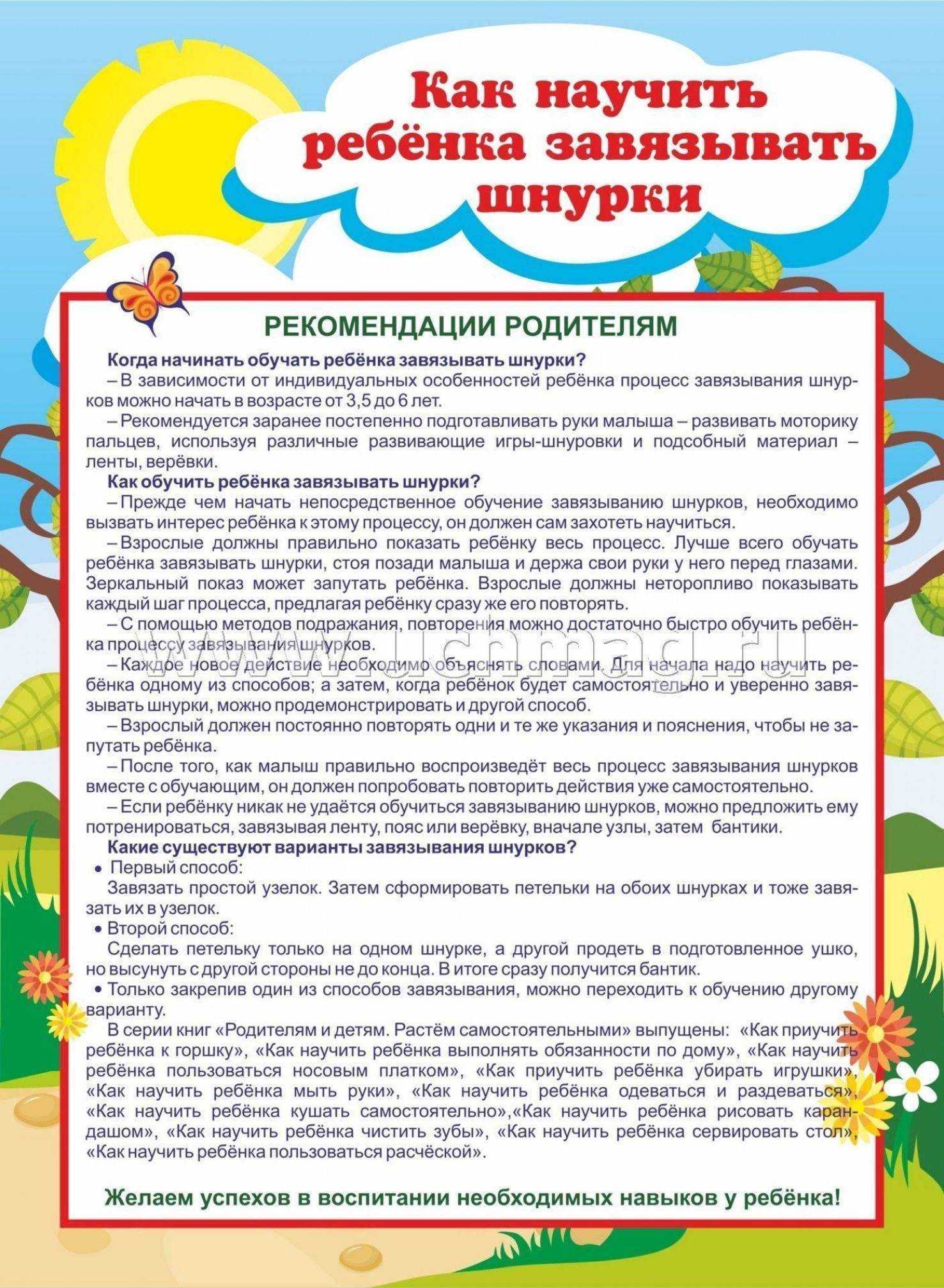 Существует несколько правил по обучению ребёнка завязыванию шнурков на обуви: — подходящий возраст для обучения это 4-6 лет, так как к этому времени у ребенка формируется моторная функция. — необходимо учитывать более раннее развитие девочек. При появлении желания у своей дочки учиться завязывать шнурки, нужно помочь ей в этом. Даже если ей не исполнилось четырёх лет. — ребёнок должен знать, где у него находиться левая и правая нога. — не нужно показывать ребёнку сразу несколько вариантов шнуровки. Ребёнок может в них запутаться. — ребёнок быстрее запомнит шнуровку, если при этом повторять одни и те же слова-объяснения. — помогать ребёнку в завязывании шнурков лучше находясь с боку или сзади.