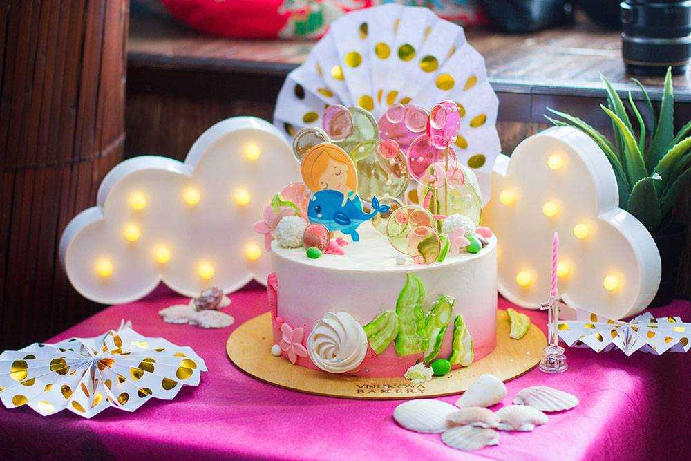 Для оформления стола я купила одноразовые скатерти, бумажные тарелки, стаканчики, салфетки, трубочки с русалочками. Также взяла набор стеклянных камушков, которые обычно кладут в кашпо с цветами, и морские ракушки. Центральной фигурой на столе стала стеклянная ваза с попкорном, ракушками и жемчужными бусами — это была имитация морской пены. Торт стоял на отдельном столике, который мы оформили двумя светильниками-облаками и бумажными веерами.