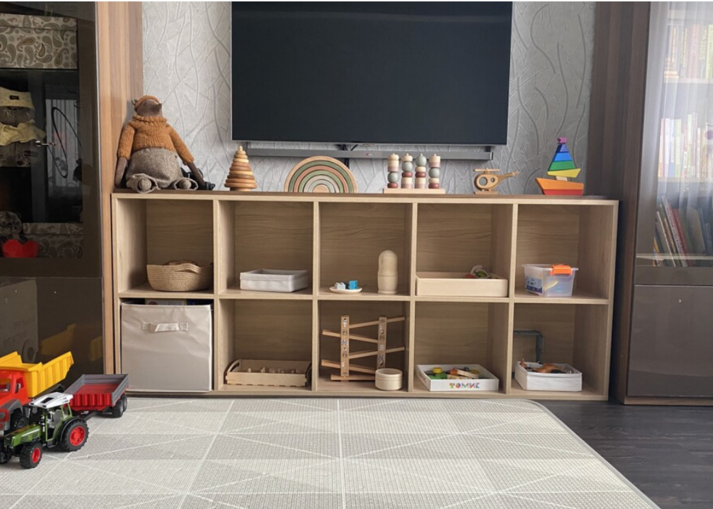 Для ребёнка в возрасте около года на полке следует оставлять не более 5 игрушек. А после 2 лет — не более 10. Следите за тем, как малыш играет, концентрируется ли на игре с одним материалом, убирает ли на место. Если интерес ребёнка пропадает очень быстро, он разбрасывает все игрушки — сократите их количество. Лучше регулярно менять одни игрушки на другие (раз в 1-2 недели), поддерживая интерес малыша к зоне игр, чем выставлять всё и сразу.