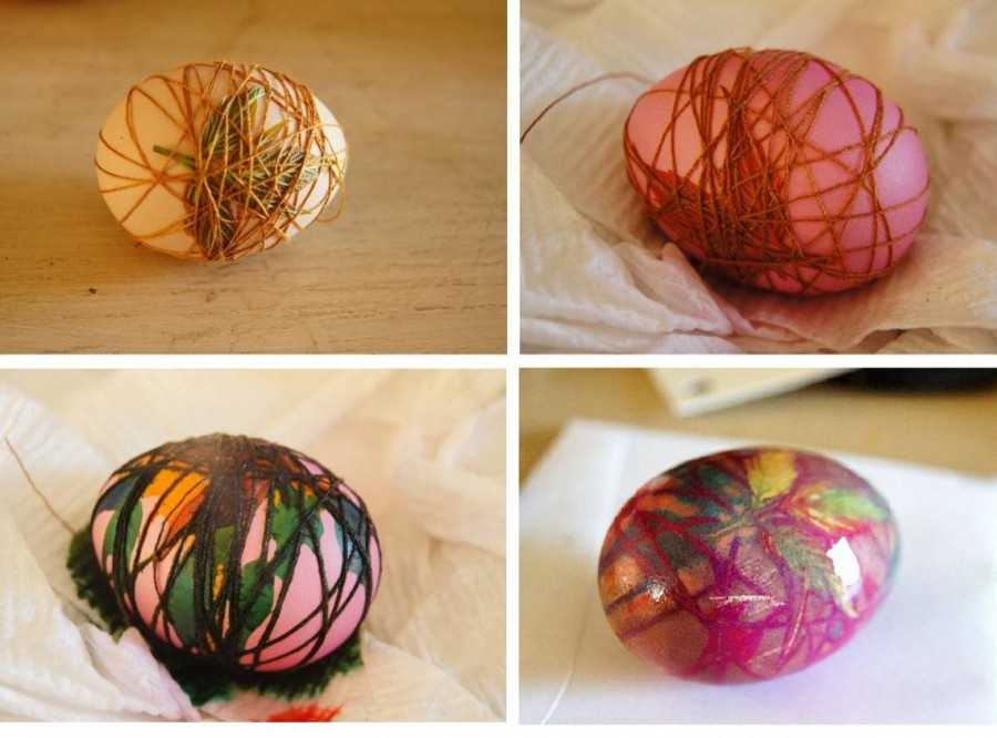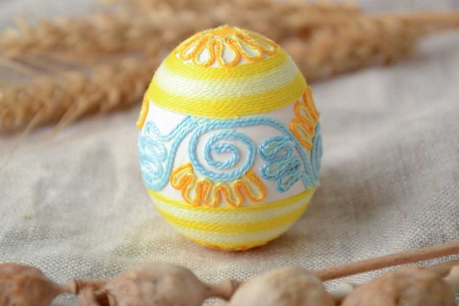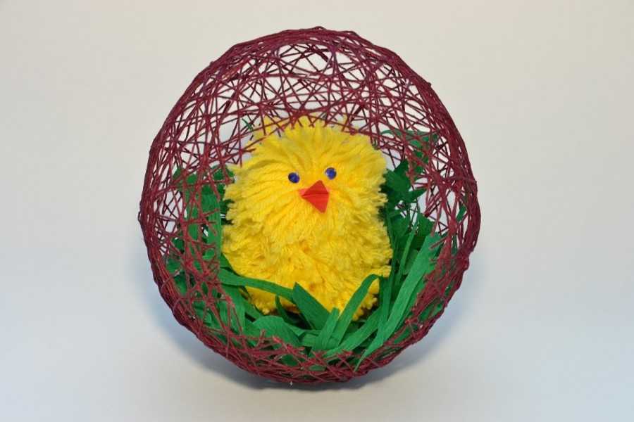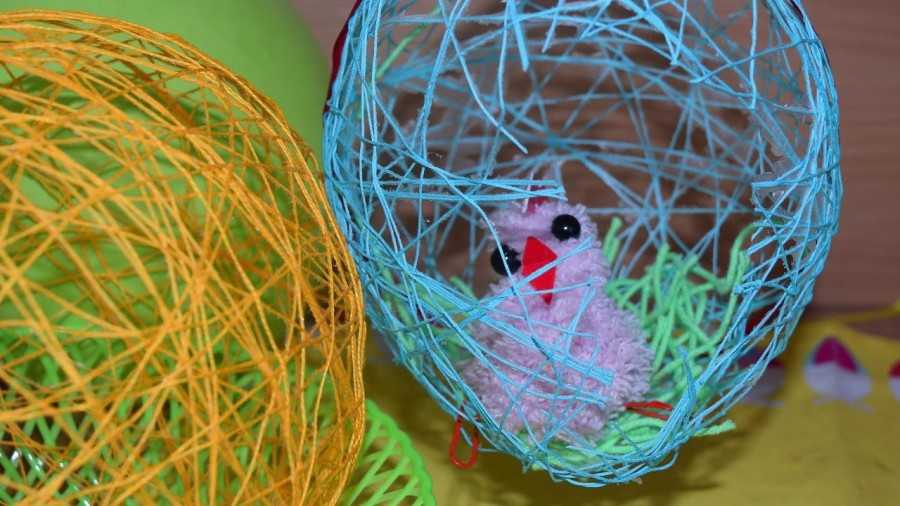 Нитки никуда не денутся и останутся на своем месте, сохраняя форму яйца. С этой конструкцией можно сотворить все что угодно. Можно вырезать в ней арку или дверцу, и заправить содержимое разными вкусностями или сувенирами. Сверху, конструкцию можно украсить бисером или различными поделками из цветной бумаги.