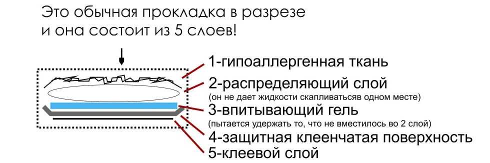Сама прокладка состоит из нескольких слоев, самое важное, это первый слой, который прилегает к телу женщины, он должен быть гипоаллергенным