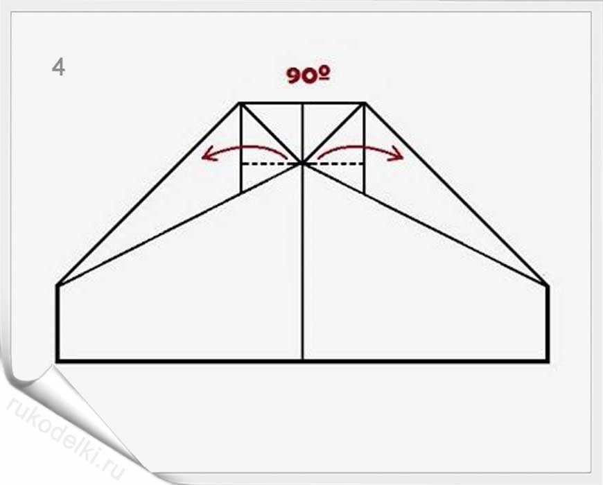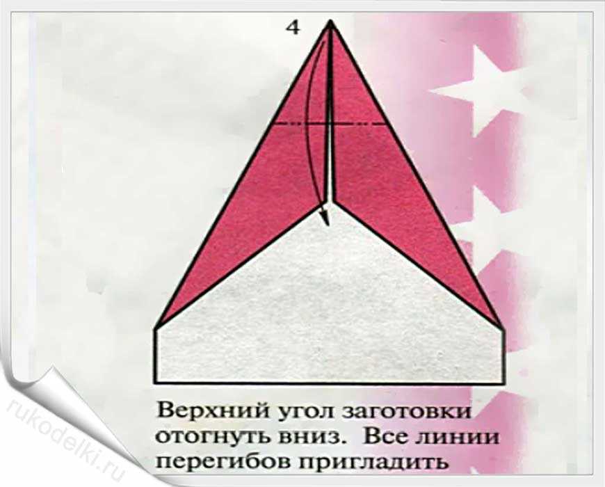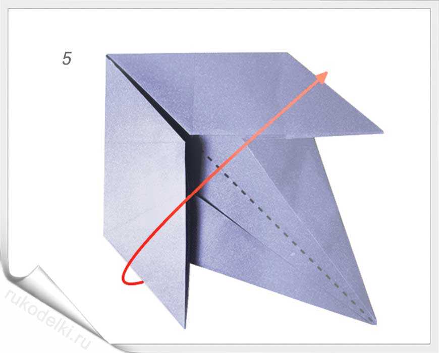 - Получившийся угол сгибаем на себя и одновременно отворачиваем вперед угол, который после всех манипуляций будет находиться на обратной стороне макета. Должна получиться фигура, как показано на рисунке ниже.