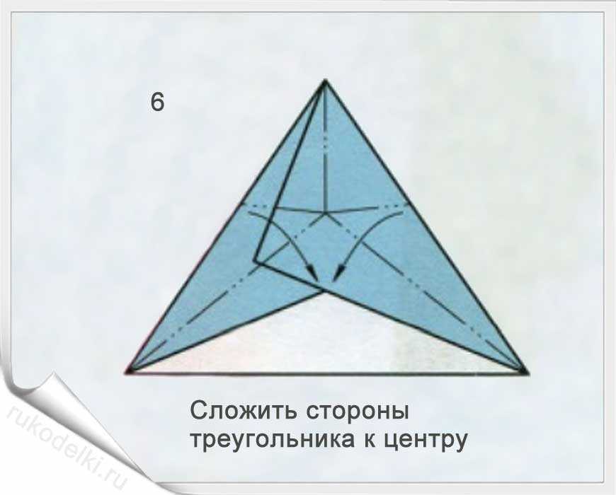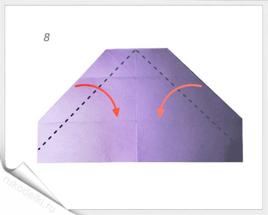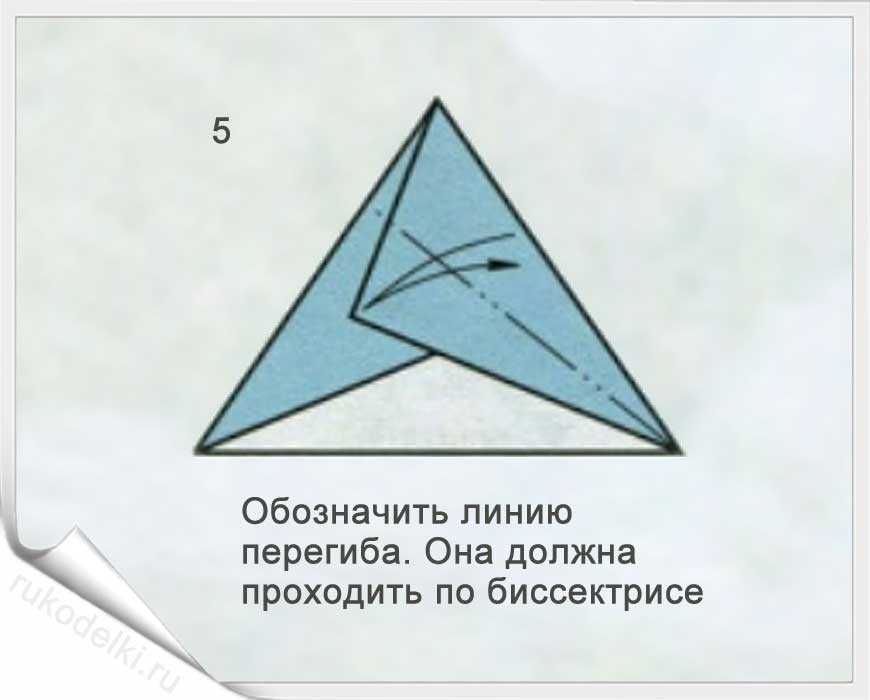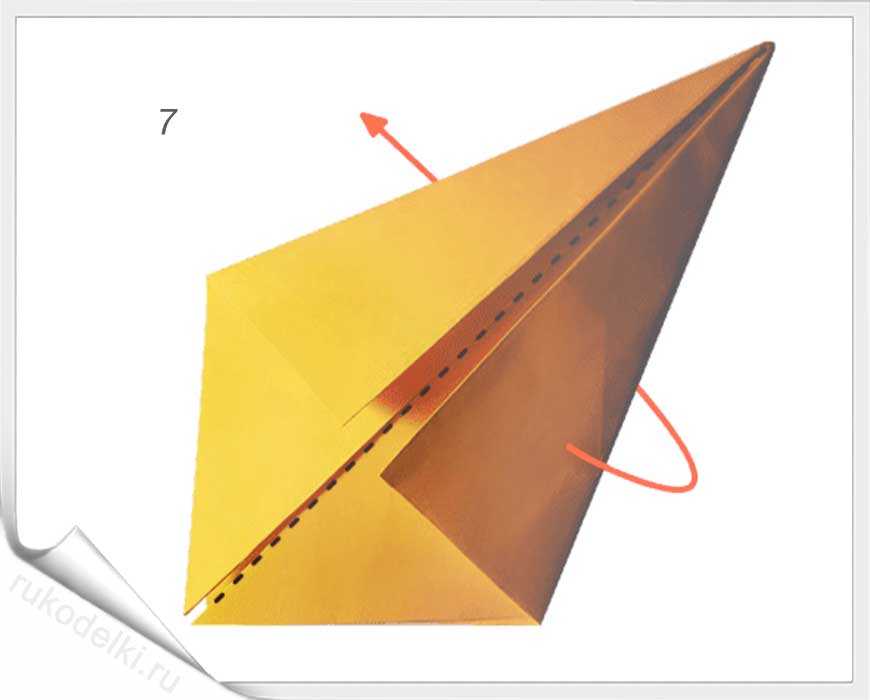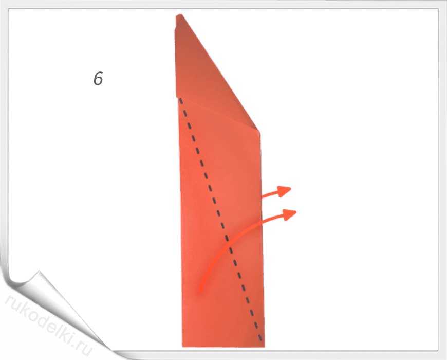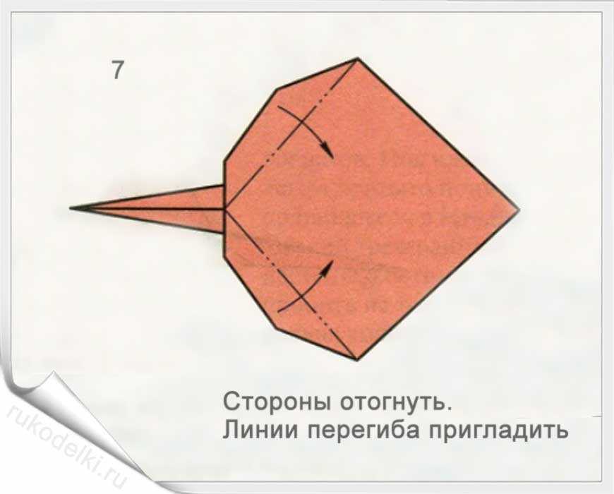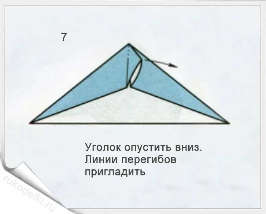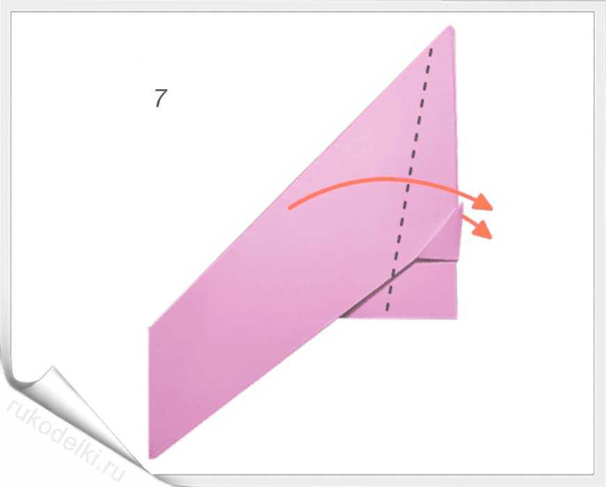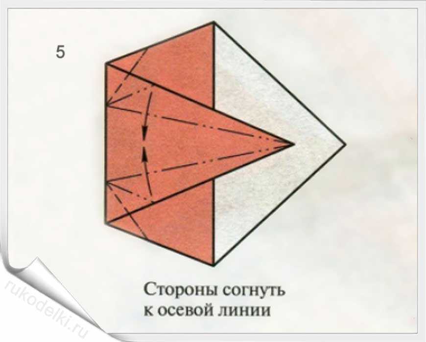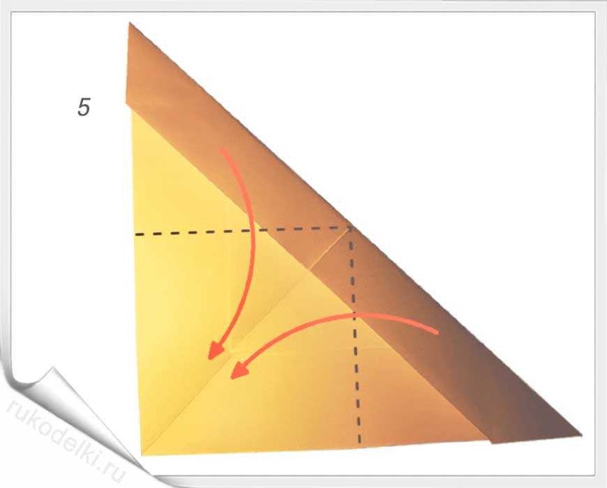 5-7. По той линии, которую мы уже сформировали сгибаем правый угол. Отгибаем его уголок по вертикальной линии (см. рисунок). Загибаем нижний уголочек.