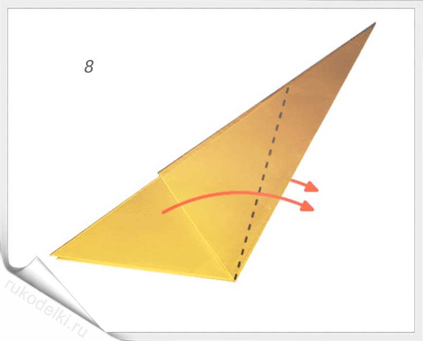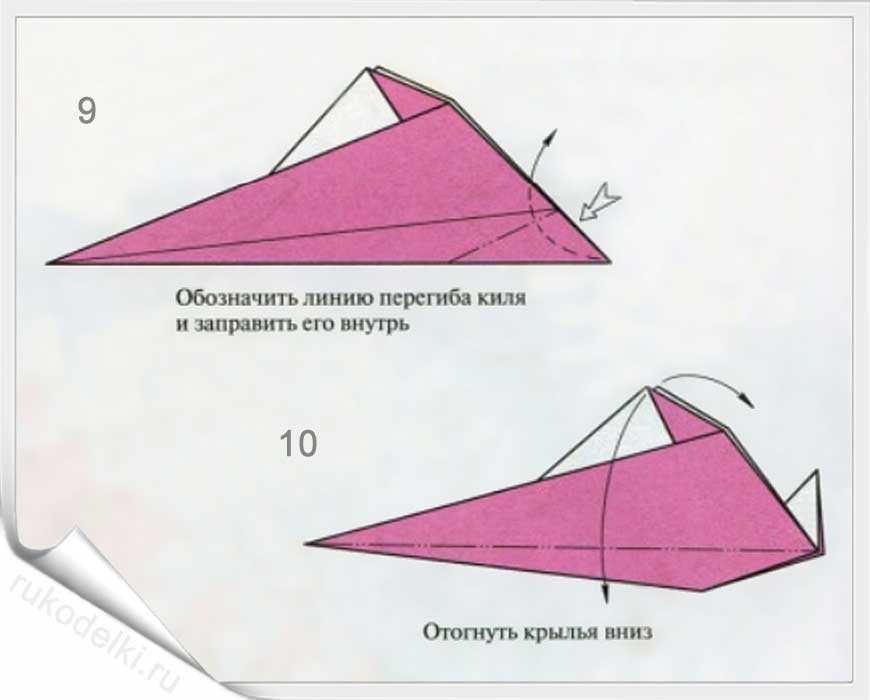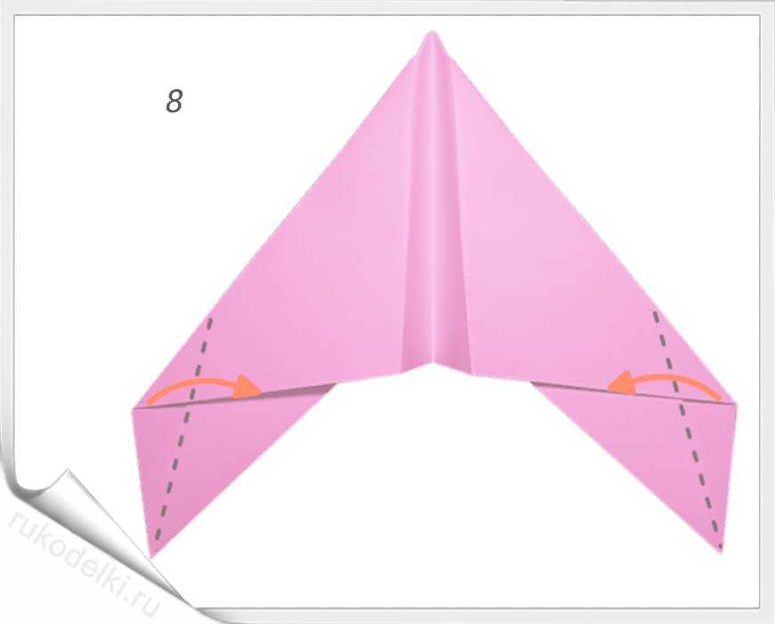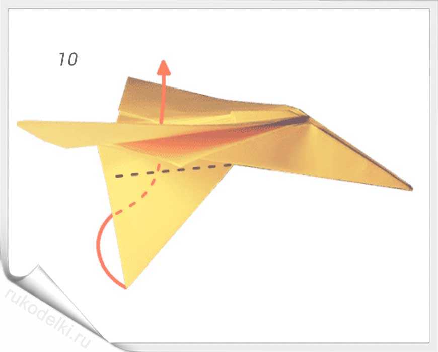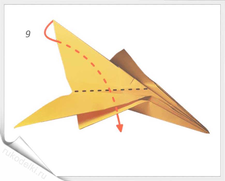 8-10. Теперь сгибаем углы по отмеченной в рисунке линии с заранее загнутыми углами. Проглаживаем линии сгиба и сгибаем кончик до точки соединения крыльев самолета.