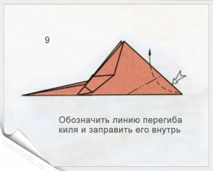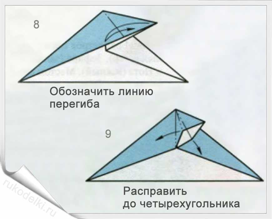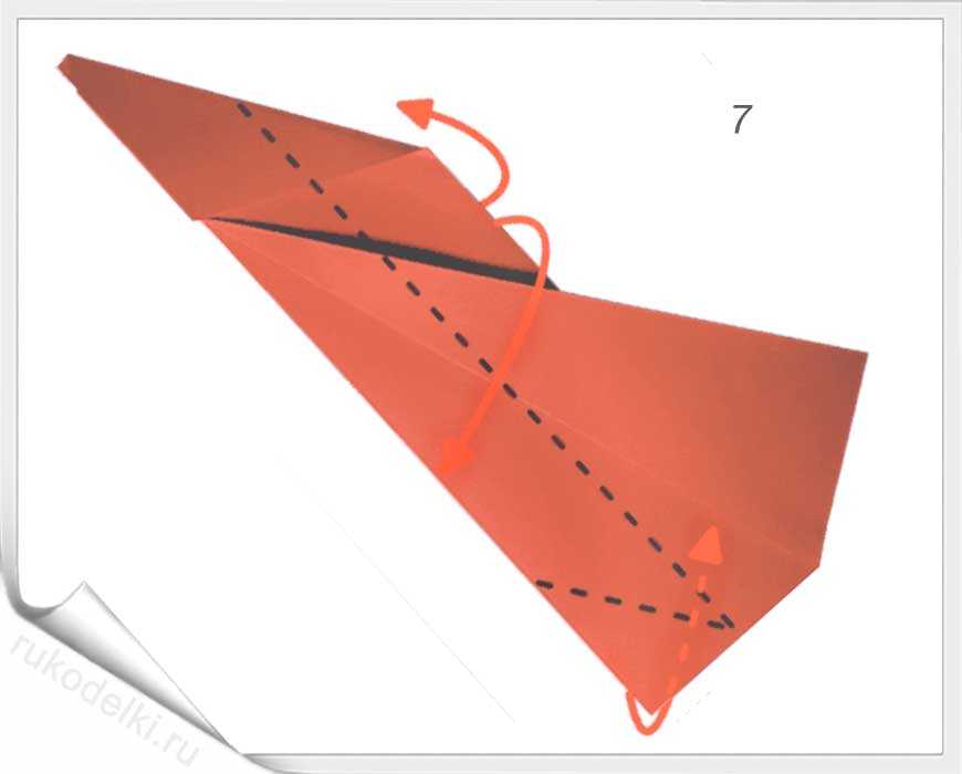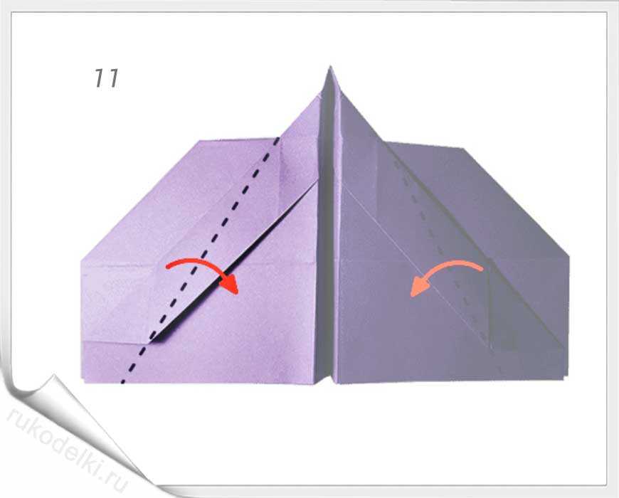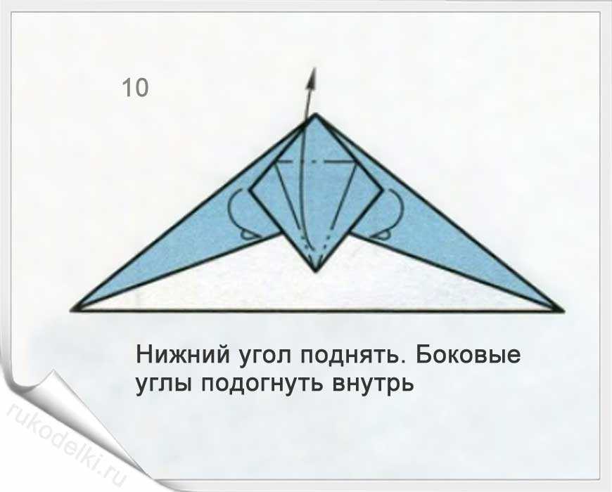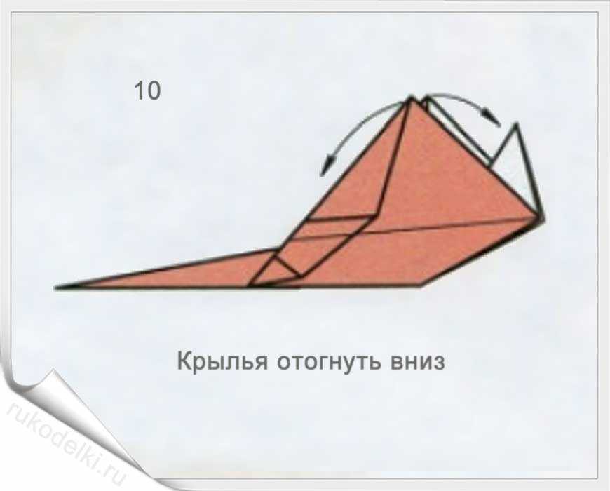 8-10. Теперь сгибаем углы по отмеченной в рисунке линии с заранее загнутыми углами. Проглаживаем линии сгиба и сгибаем кончик до точки соединения крыльев самолета.