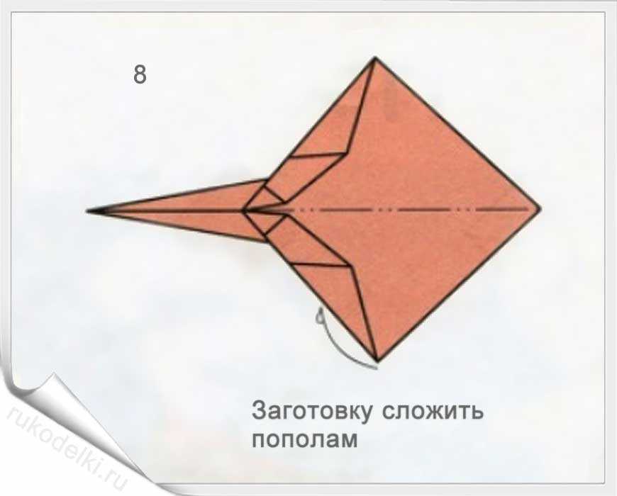 Перегибаем по центру лист и отгибаем крылья. Те ромбы, что у нас получились нужно загнуть так, чтобы они смотрели вверх