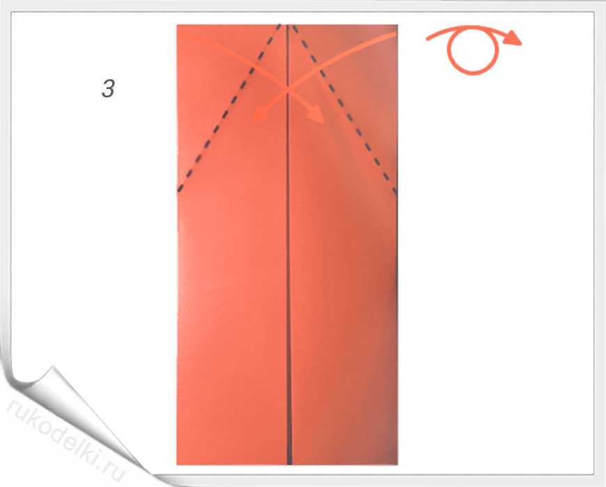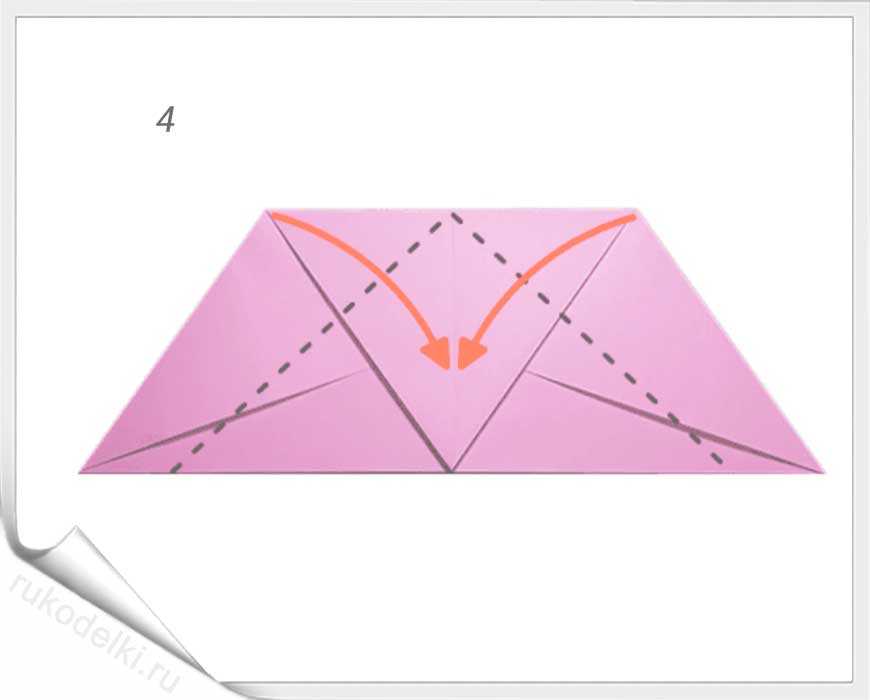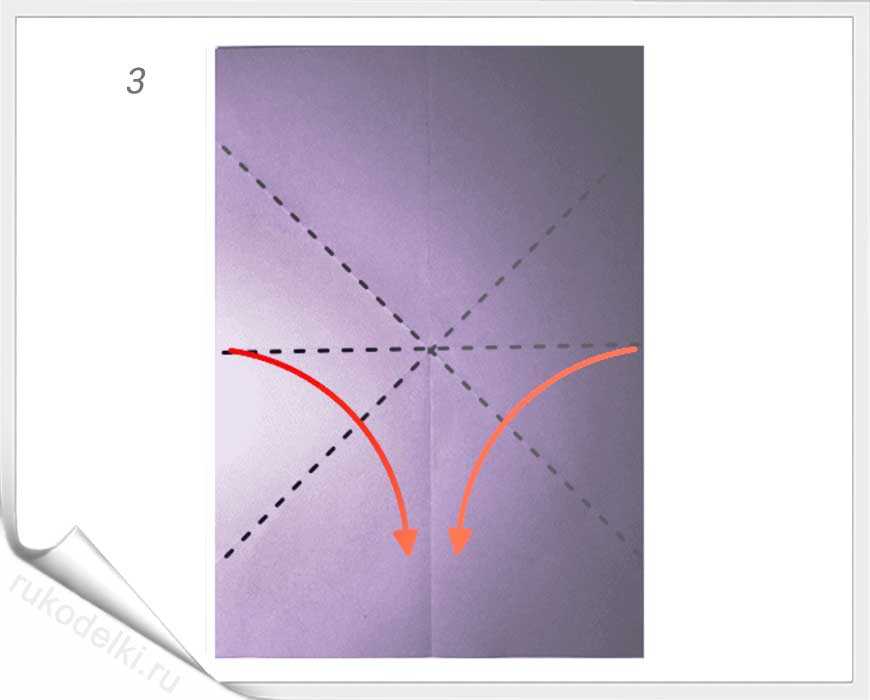 3-4. Теперь нужно перевернуть лист бумаги и отогнуть верхние края к центральной линии.