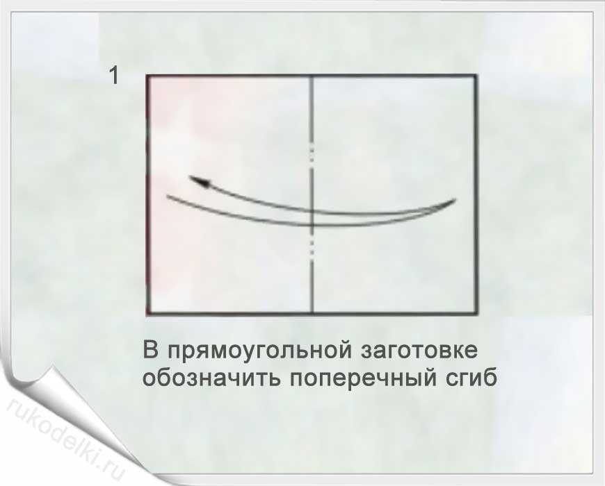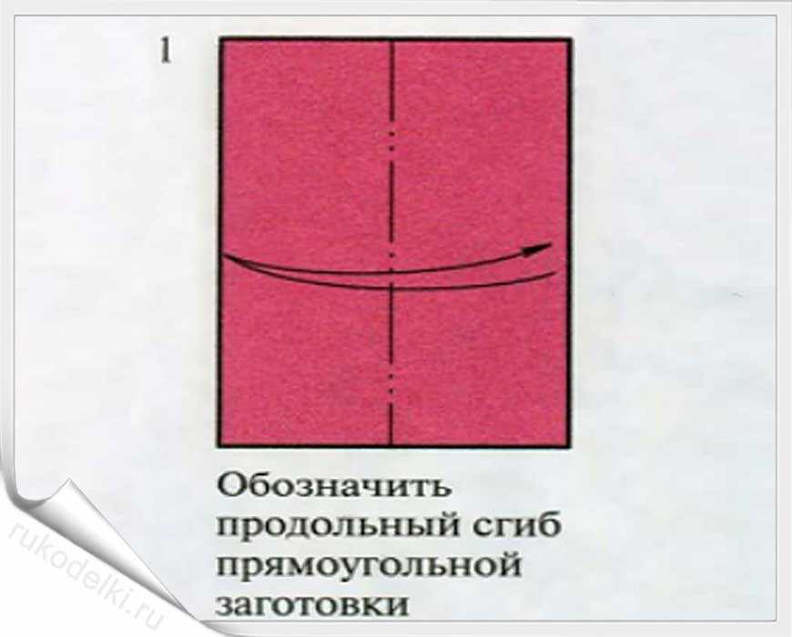 - Берем листик бумаги прямоугольной формы, сгибаем его пополам вдоль большей стороны и намечаем середину.