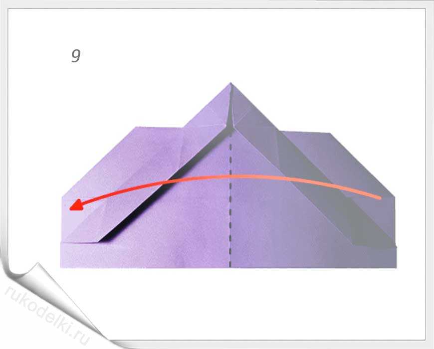 Теперь сгибаем наш самолет еще раз пополам, теперь уже вдоль. Таким образом, чтобы острый угол был снаружи. Проверяем, все ли симметрично. Теперь уголки нужно подвернуть, совсем немного, как показано на фото. Я нарисовала пунктирную линию, чтобы Вы видели, где примерно должен быть сгиб.
