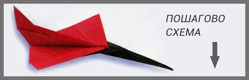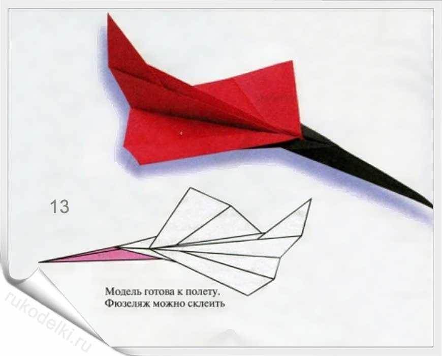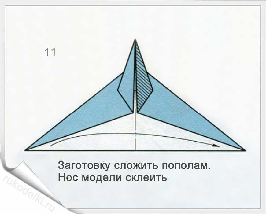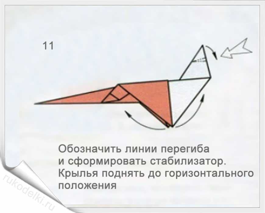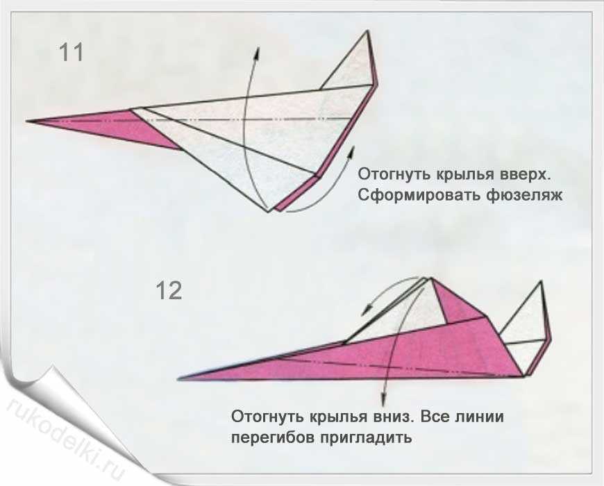 11-12. Выдавливаем бумажный хвостик между крыльями. Придайте самолетику из бумаги законченный вид ориентируясь на рисунок готовой модели.