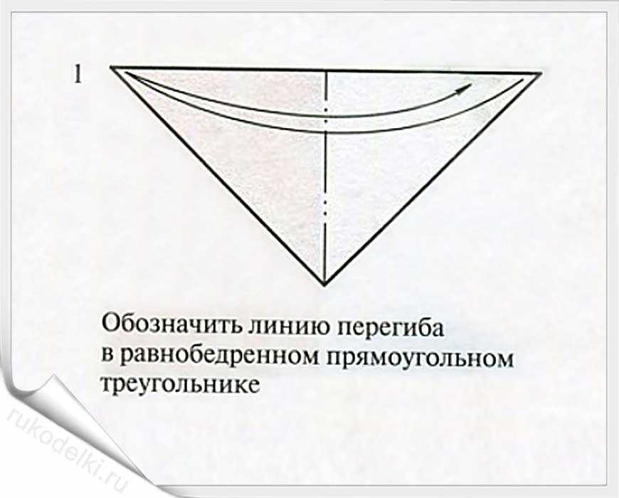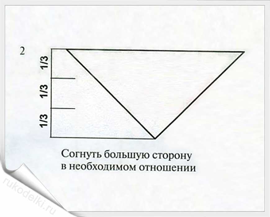 Лист бумаги складывается от правого угла к противоположному так, чтобы на краю осталось свободное пространство. Должен получиться треугольник. Из оставшегося свободного листа каждый угол еще раз подгибается таким образом, чтобы получились треугольники.