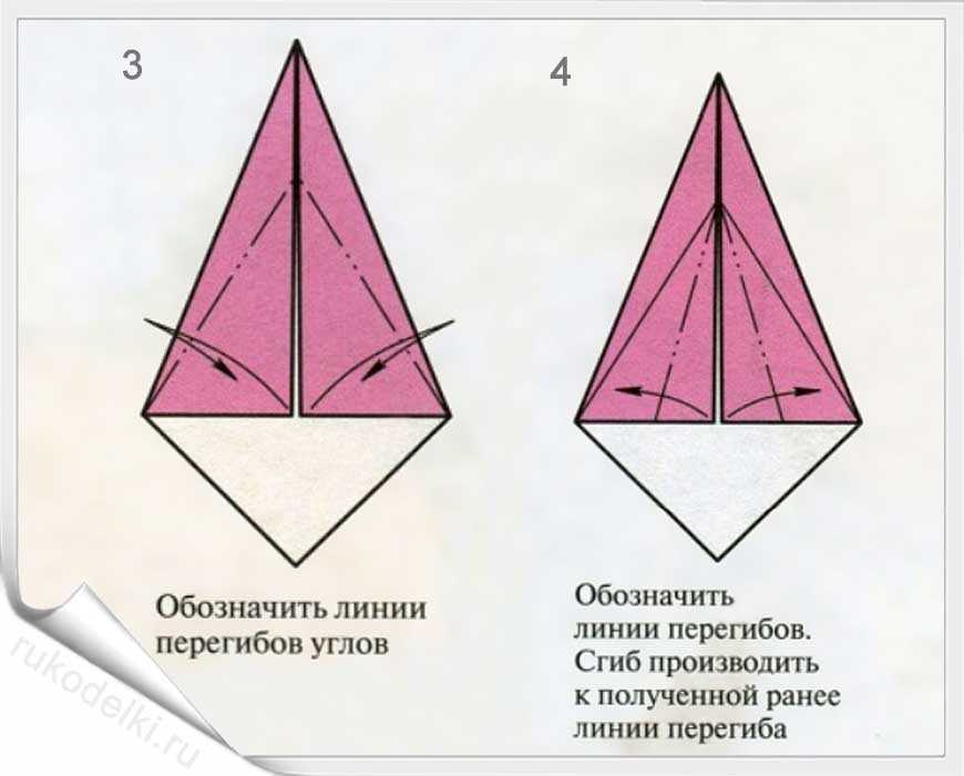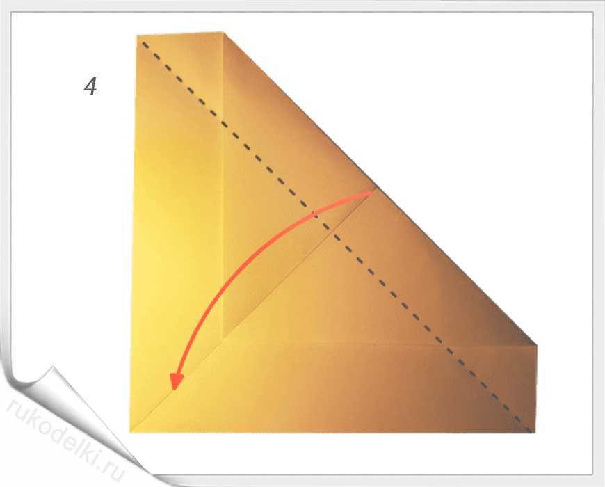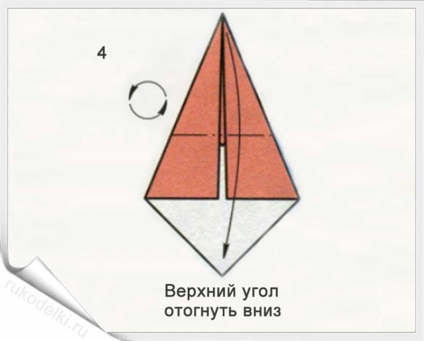 3-4. Отгибаем лист и повторяем вышеописанное действие с противоположным углом. Затем загибаем маленькие уголки и верхушку листа.