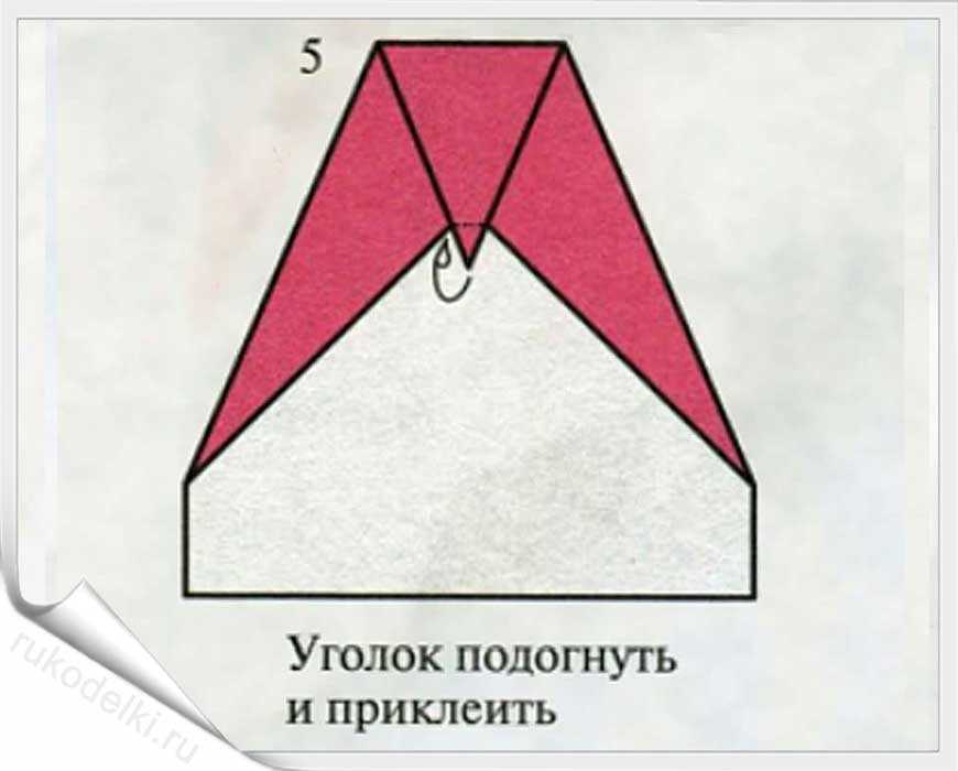 Теперь этот уголок вогните внутрь. Должно получиться, как на фото (вид снизу и сверху).