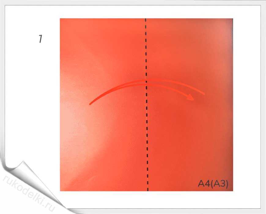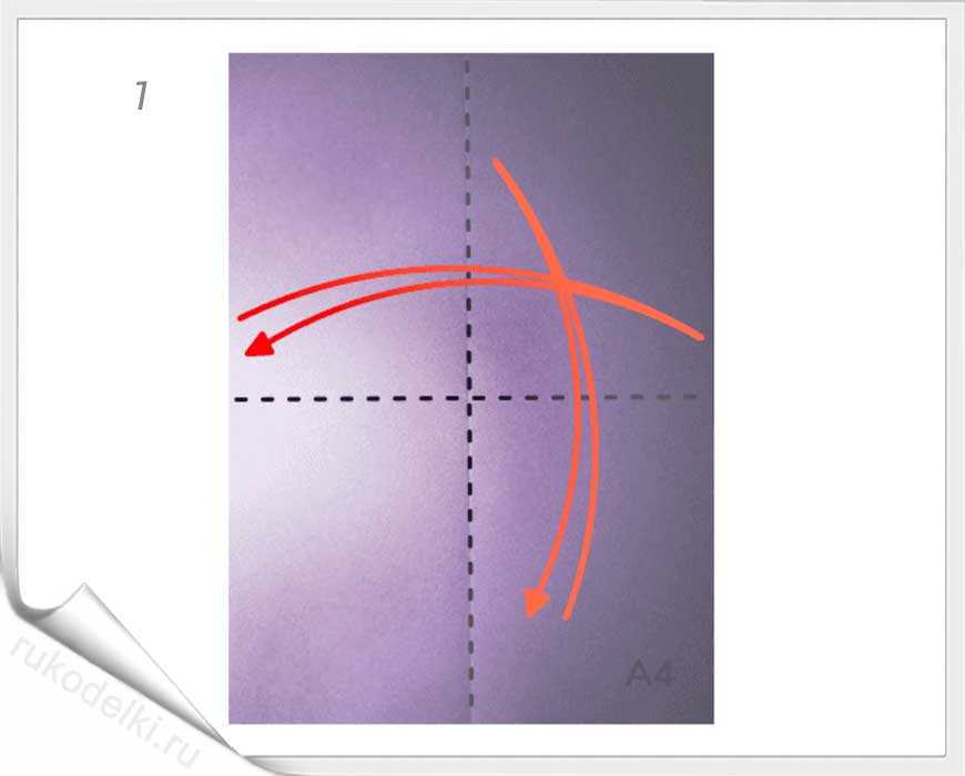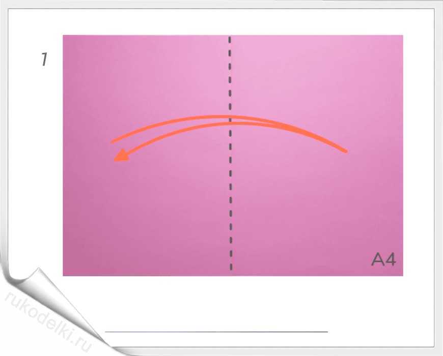 1-2. Бумажный лист складываем пополам по продольной линии. Разгибаем лист и соединяем правый лист с левым краем по пунктирной линии.