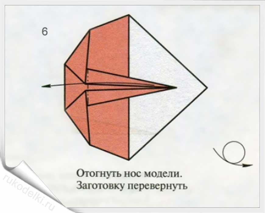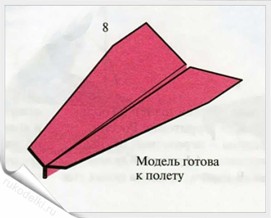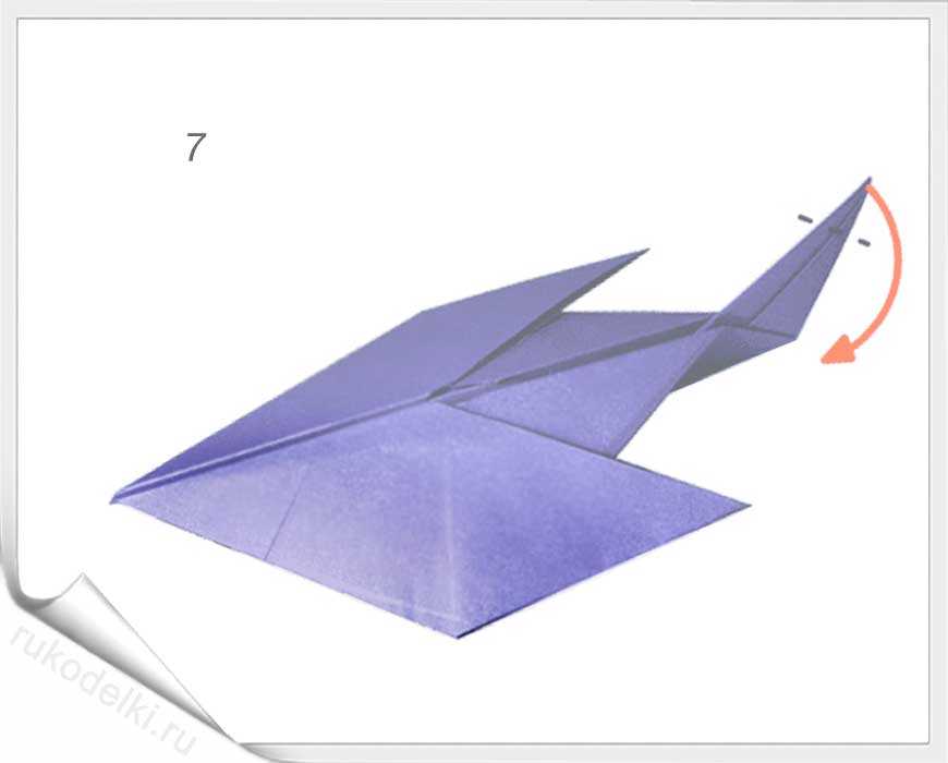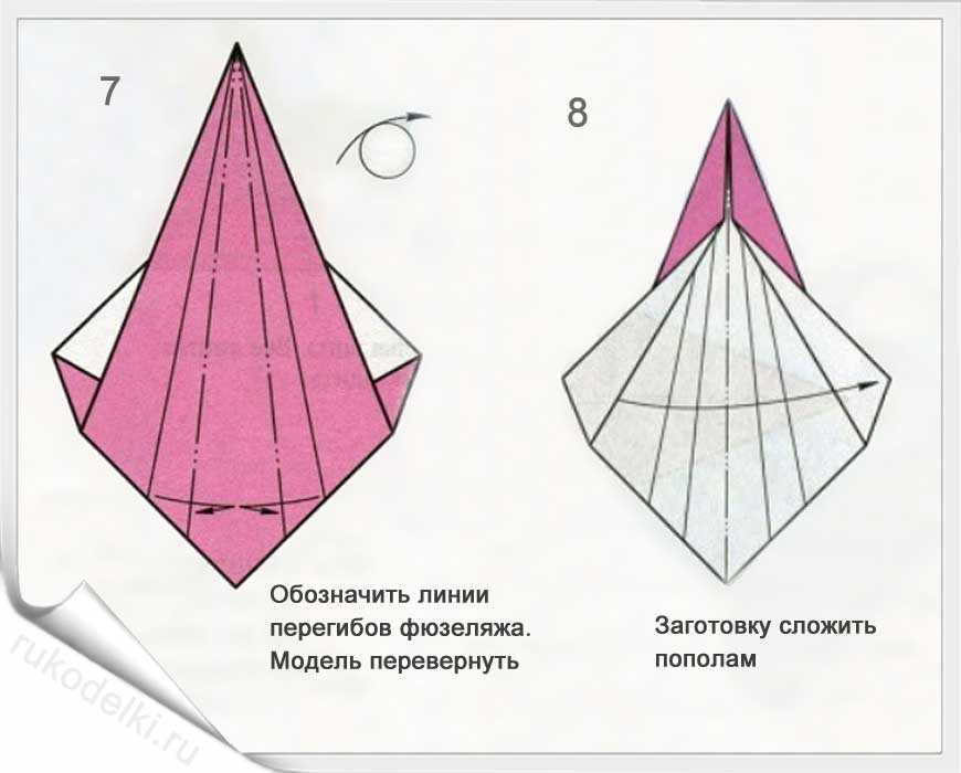 8-10. Повторяем вышеописанные пункты для противоположной части листа. Загибаем носик и сгибаем самолетик пополам. При формировании крыльев нужно тщательно прогладить линию сгиба.