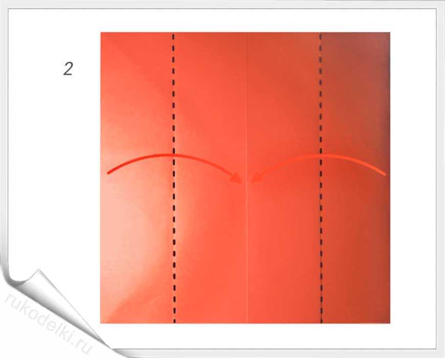 - Сделать серединную глубокую складку – двойной сгиб. Для этого бумажный квадрат нужно сложить, развернуть и вновь сложить в обратном направлении.