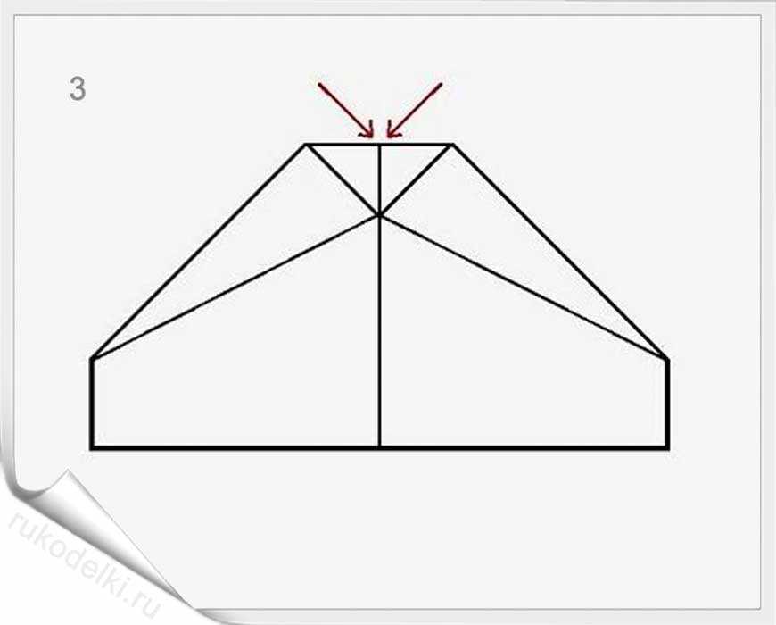 - Наложить ещё один угловой сгиб на левый сегмент. У вас должна получиться вторая половина четырёхугольника. Вместе с первой они образуют трапецию. Если не хотите ошибиться в этом и последующих шагах, следует тщательно изучить фотографии и видео, иллюстрирующие данный вариант авиалайнера.