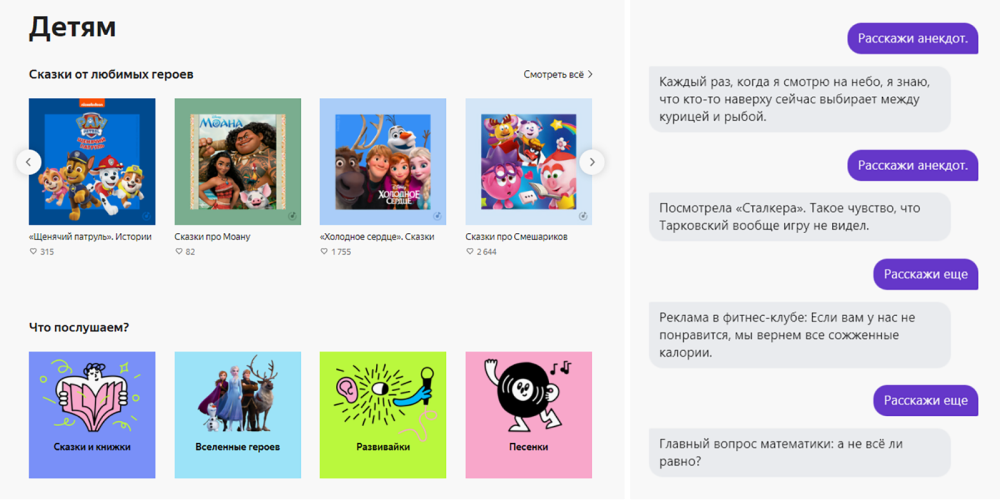 Что говорят Алисе: «Алиса, расскажи сказку», «Алиса, включи „Подушки-шоу“», «Расскажи анекдот»
