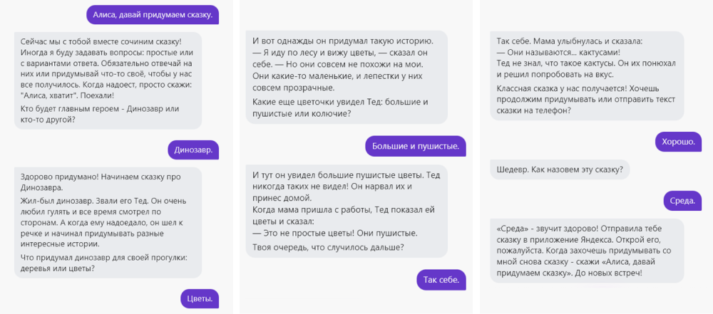 Алиса может не только включать аудиосказки, но и придумывать их вместе детьми и родителями. Происходит это так: Алиса рассказывает историю и периодически задает вопросы — о главном герое, событиях и обстоятельствах сюжета. Таким образом сказка будет развиваться в зависимости от ответов детей. Потом ее можно сохранить, слушать снова и пересылать друзьям.