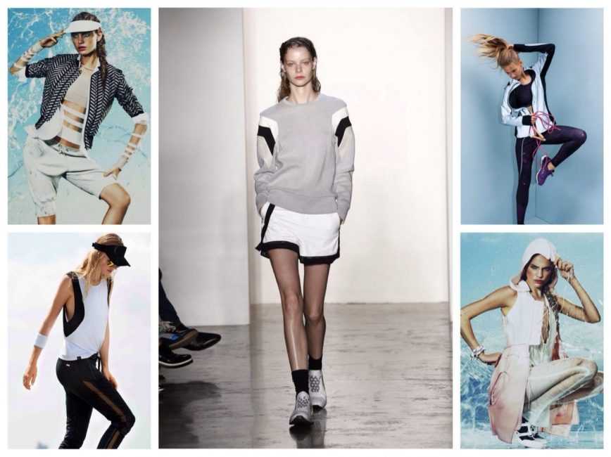 Рубашки-поло и футболки, шорты и бриджи, леггинсы и джинсы, юбочки в складку и туники, платья и комбинезоны -эти и другие предметы гардероба в спортивном стиле выполняются из «дышащих» тканей самых разнообразных оттенков. Модели часто украшаются крупными накладными карманами и погонами, хлястиками и клапанами, обильно снабжаются застёжками-молниями, кнопками, отделочными строчками. Дополнить созданный образ активной барышни можно бейсболкой, банданой, напульсниками, рюкзаком.