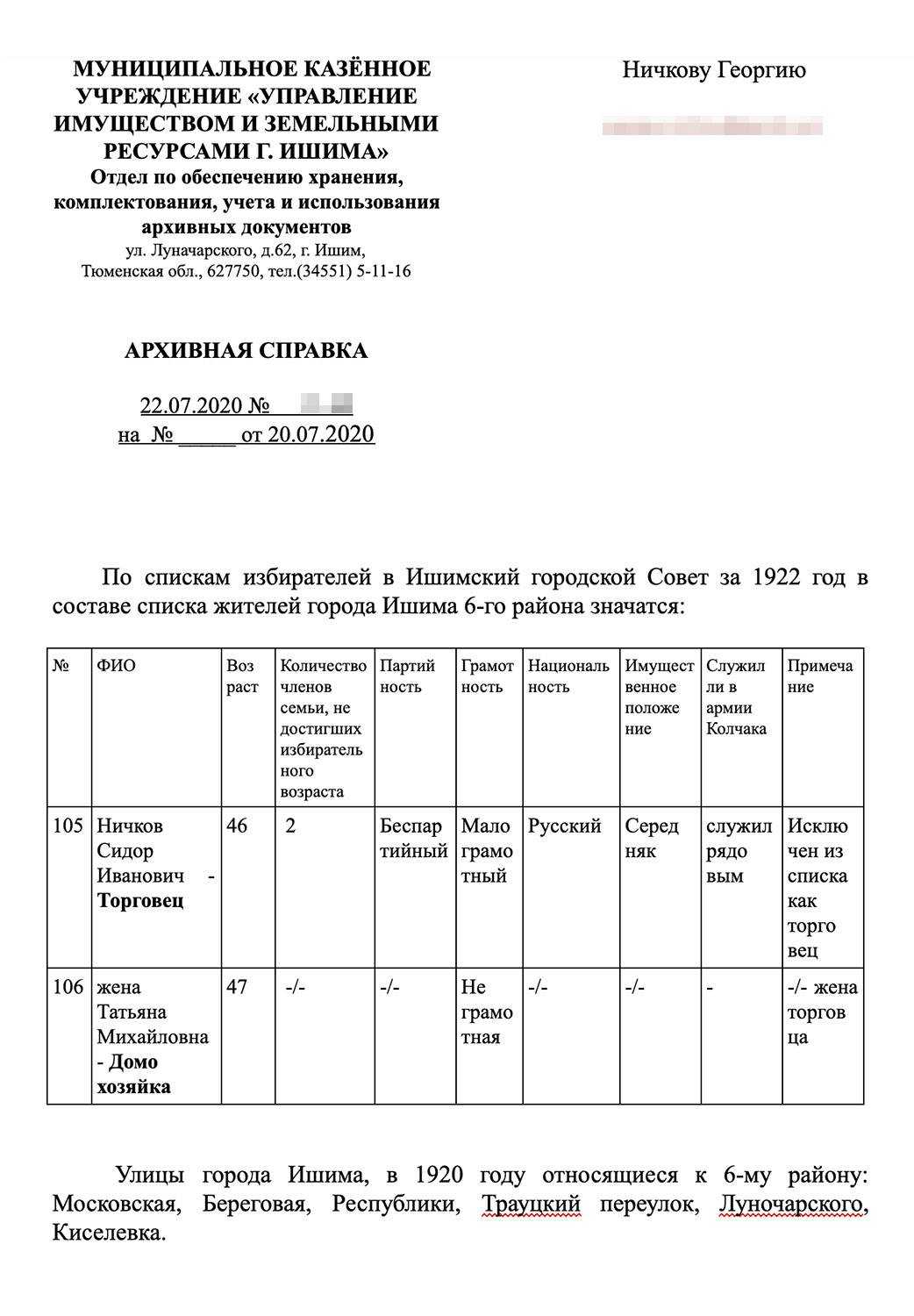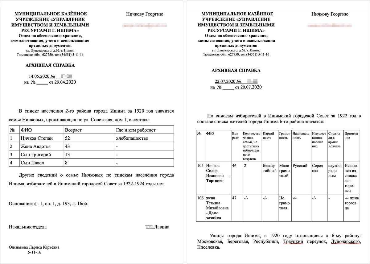 Эти справки я получил бесплатно. Просто отправил в архив Ишима запрос по электронной почте