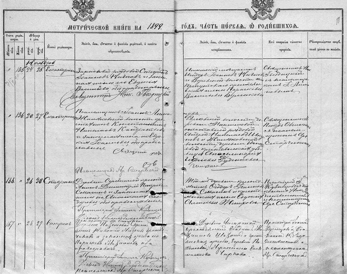 Несмотря на мещанское сословие и жизнь в городе, мой прапрадед занимался хлебопашеством, больше половины крестных его детей — крестьяне из соседних деревень. Среди крестных я также заметил двух отставных военных, с которыми он, скорее всего, проходил службу. А вот у его брата, который пошел в торговлю, крестные не такие простые: ветеринарный фельдшер, почетный гражданин, почтово-телеграфный чиновник.