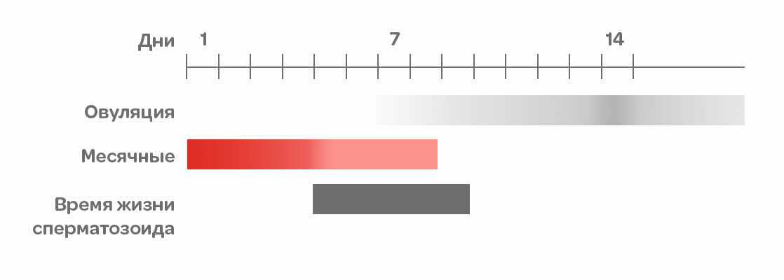 Рисунок. Вероятность овуляции, возможная продолжительность менструации и вероятность забеременеть при сексе во время месячных.