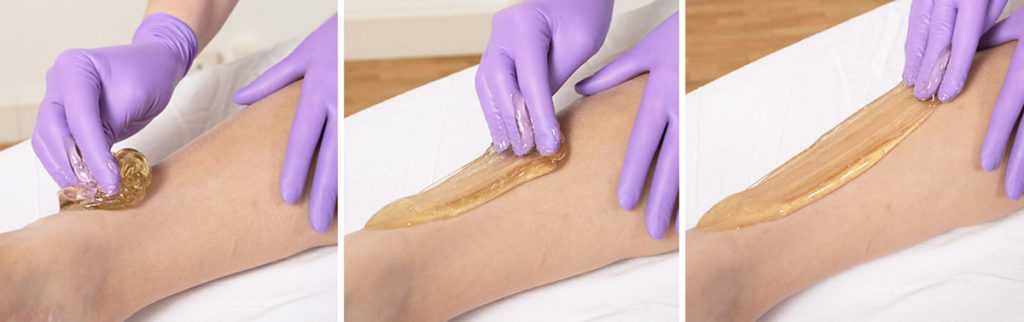 - теплую пасту (37-38 °) распределяют по коже, двигаясь против роста волосков;