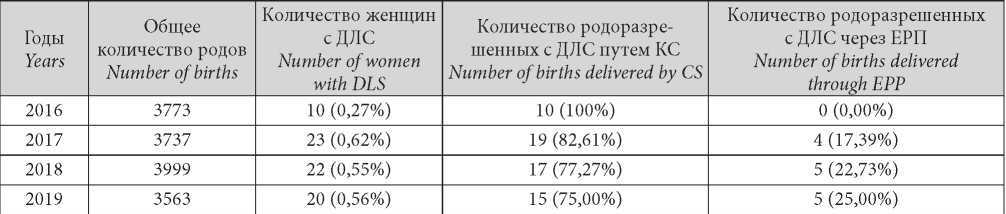 Количество родов и пациенток с ДЛС, родоразрешённых за 2016 – 2019 гг.Number of deliveries and patients with DLS delivered in 2016 – 2019